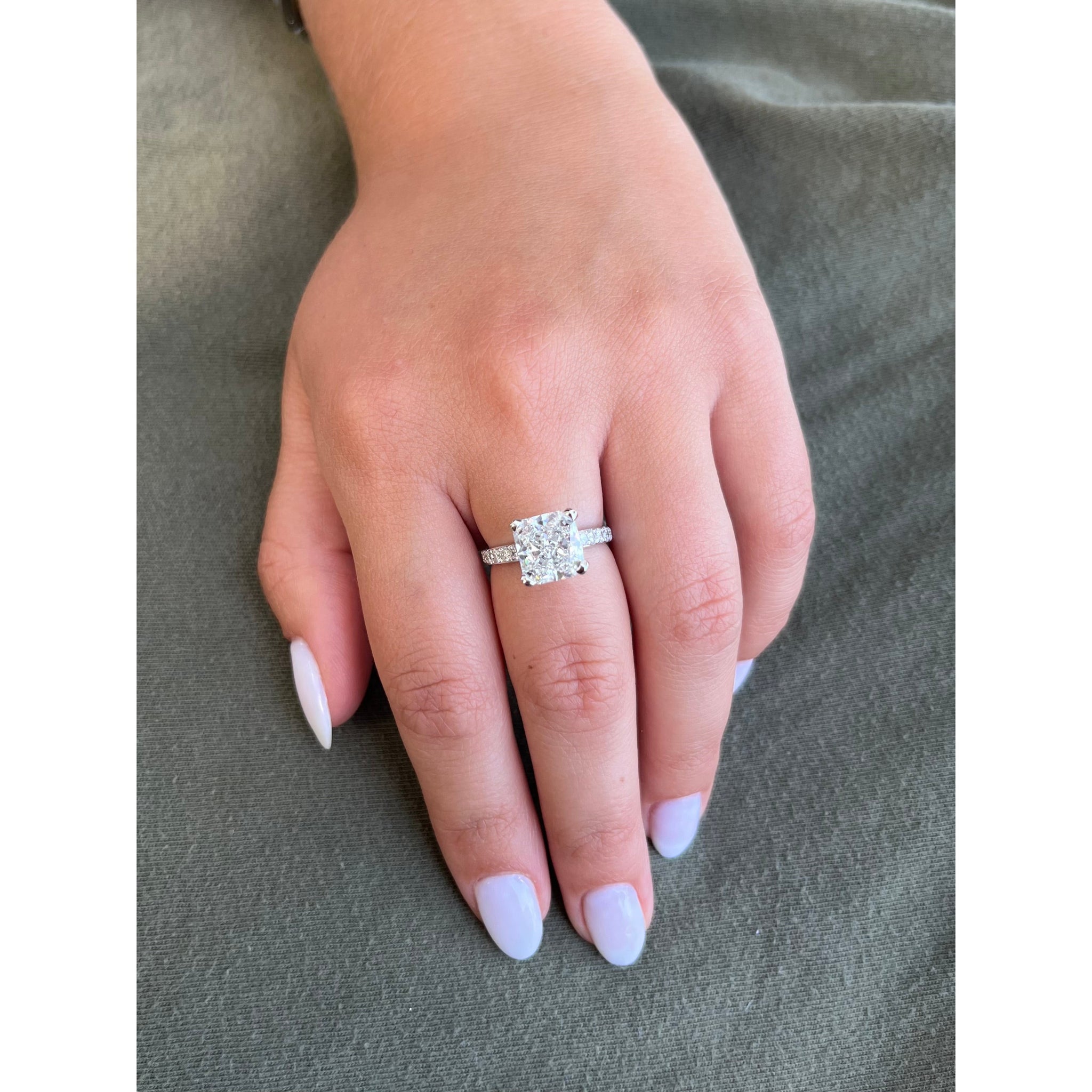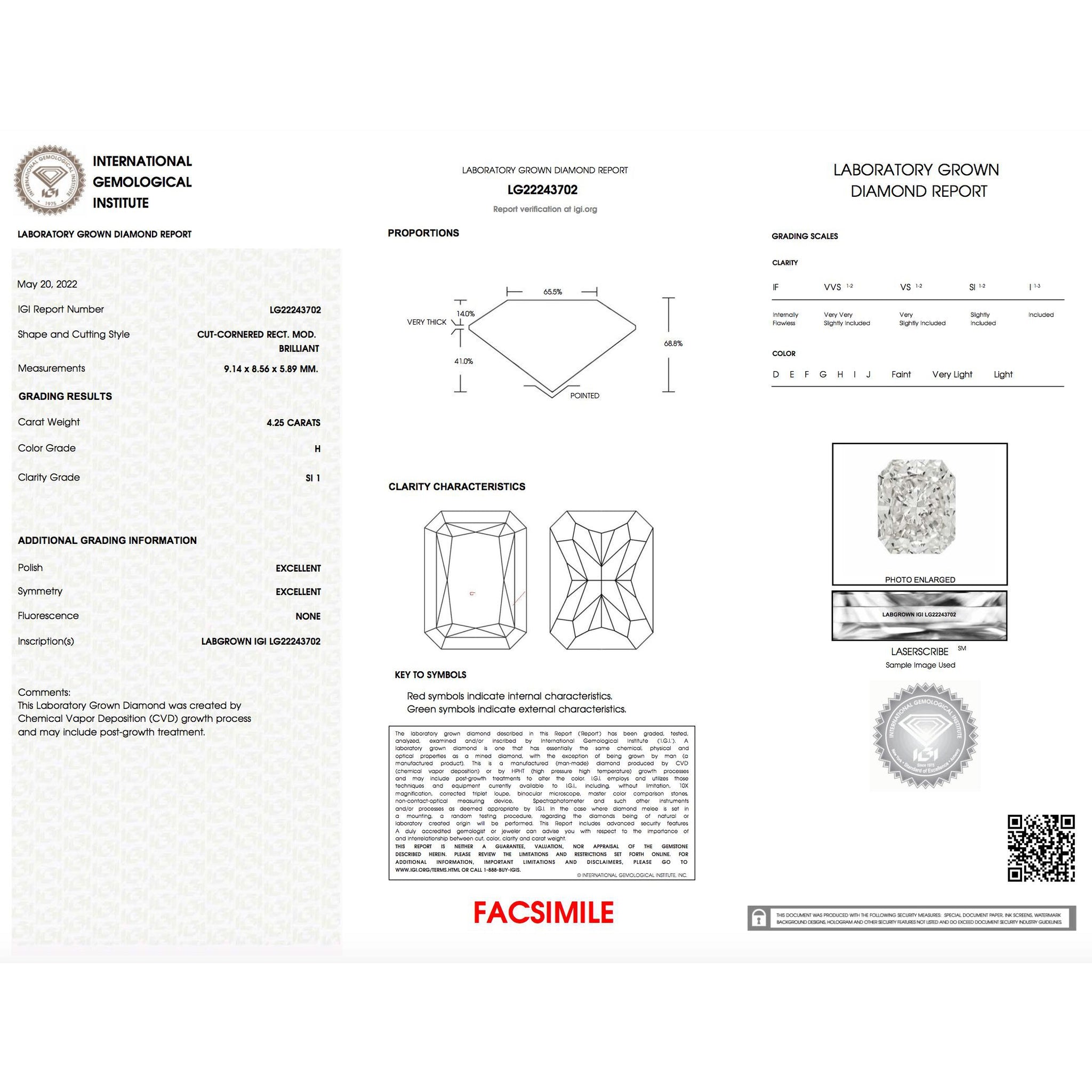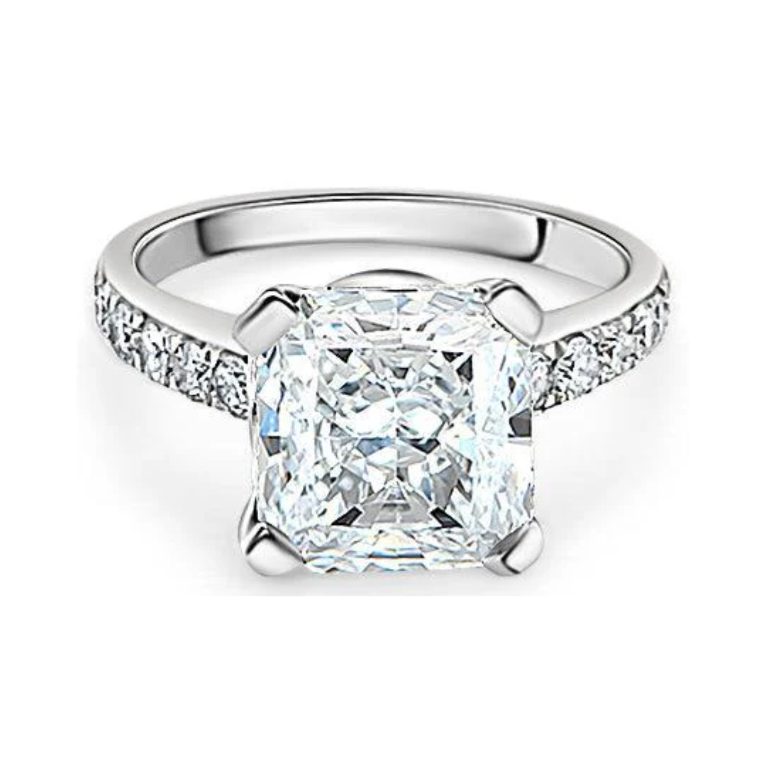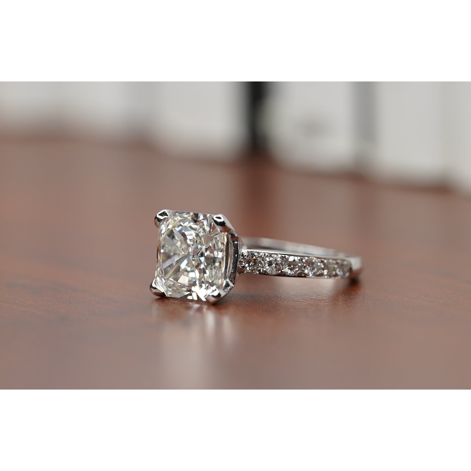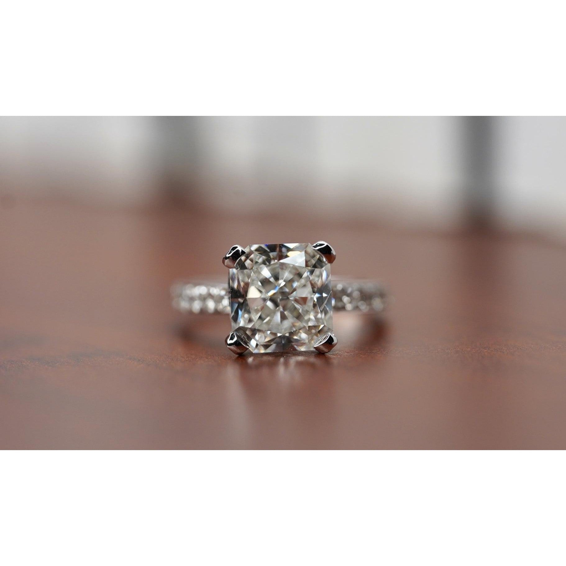 4.25-carat cushion cut Lab-grown diamond Engagement ring in 14k solid white gold. 4.25 carat, cushion cut, H color, SI1 clarity. The stone is set in a straight shank white gold ring with 0.30 carats in natural diamond side stones.