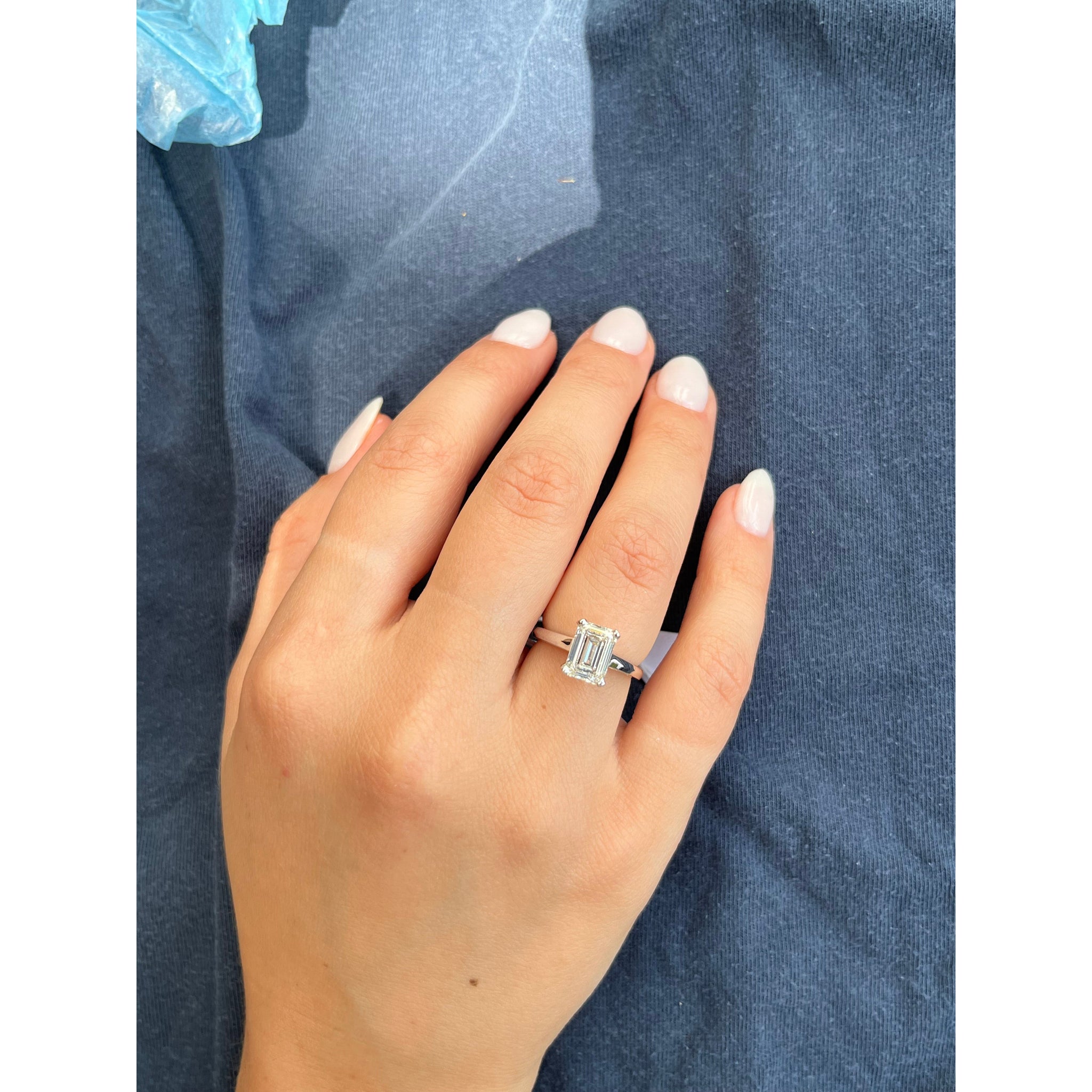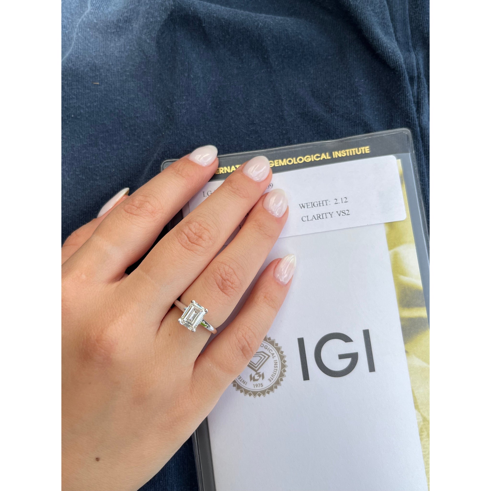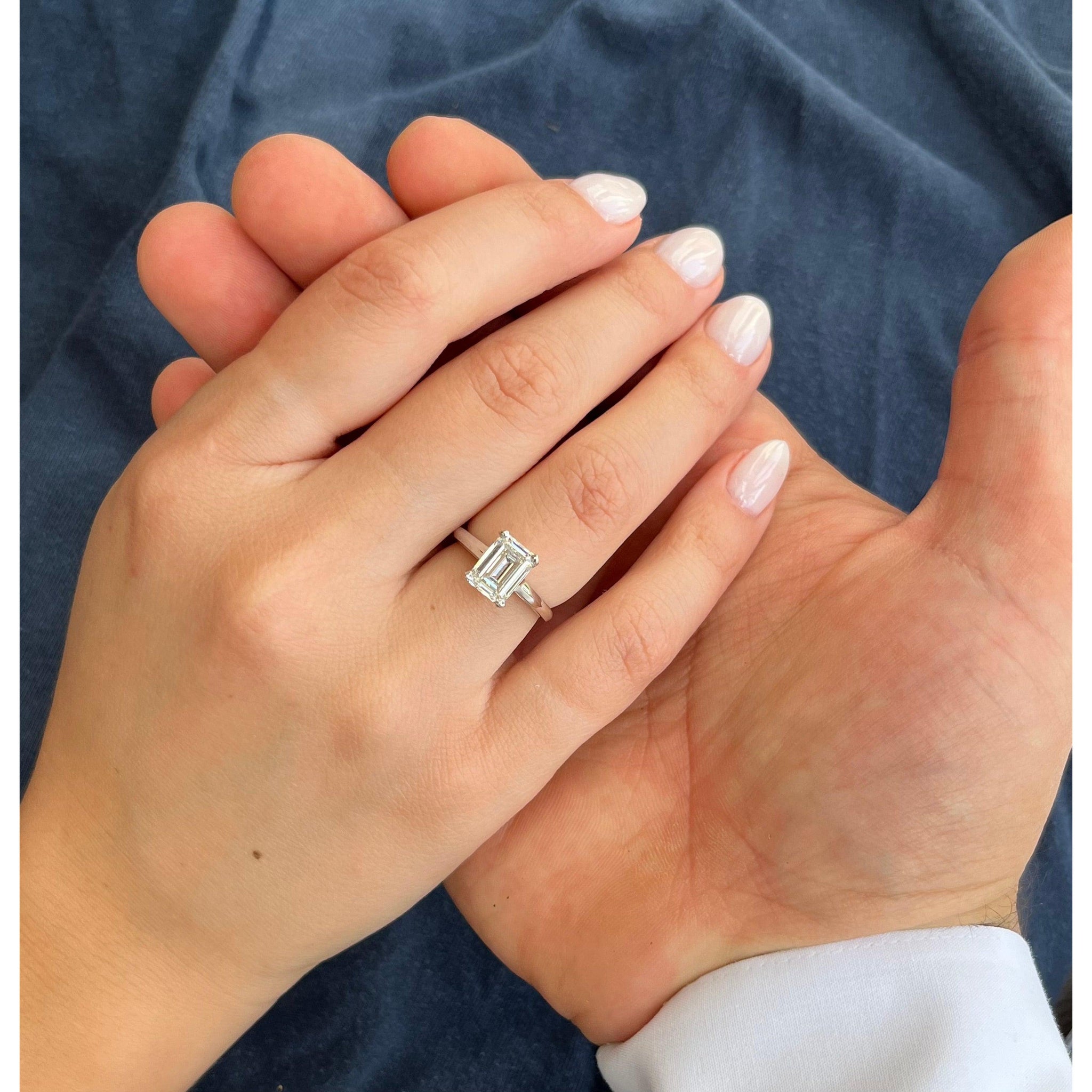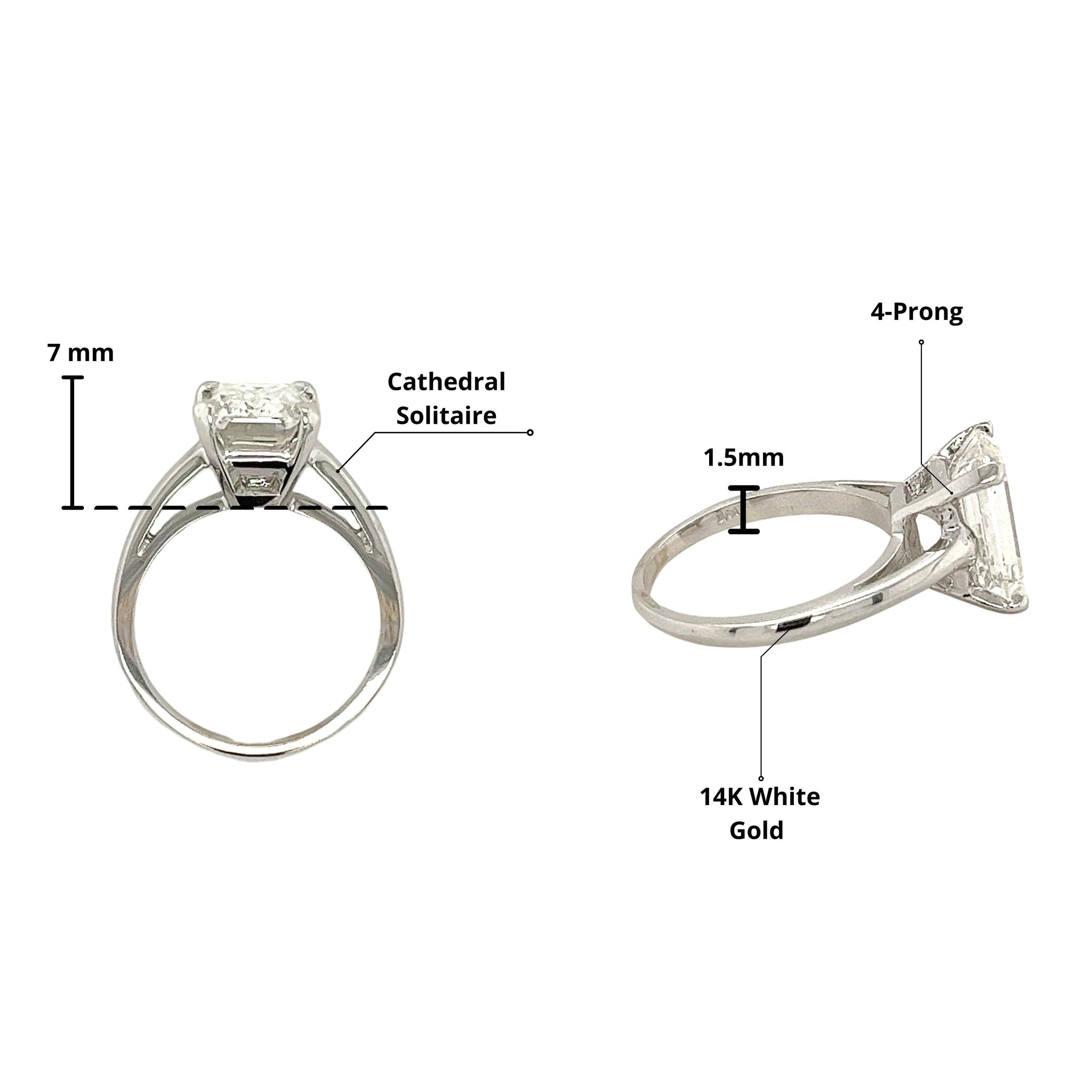 2.12 قيراط، زمرد قطع، لون H، نقاء VS2. 2.12 Carat Emerald Cut Lab Diamond Engagement Ring in 14k solid gold cathedral shank solitaire setting.