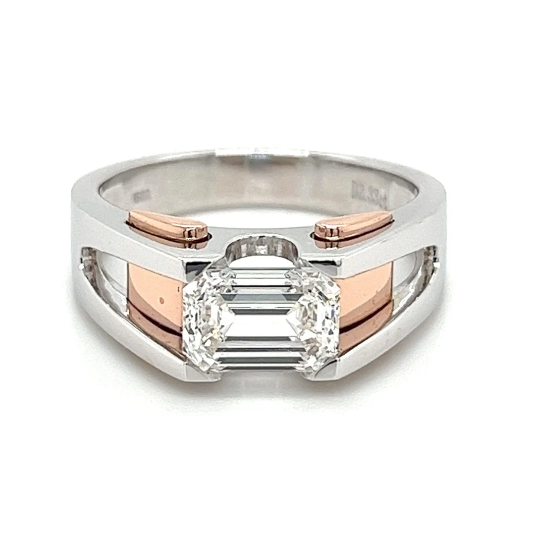 2.87 carat, Emerald cut, G-H color, VVS2-VS1 clarity lab-grown diamond set in 2-tone rose/pink and white 14k gold.
