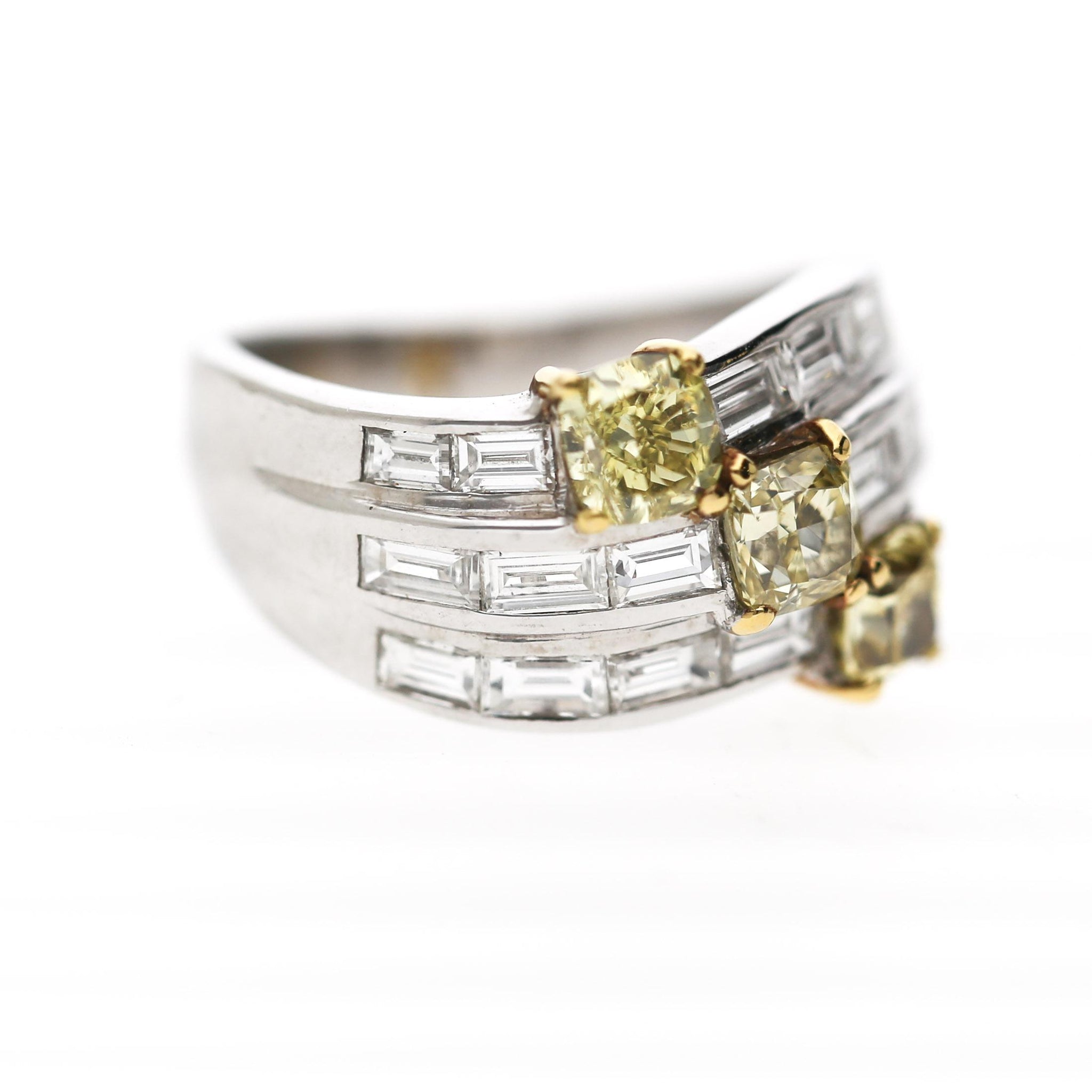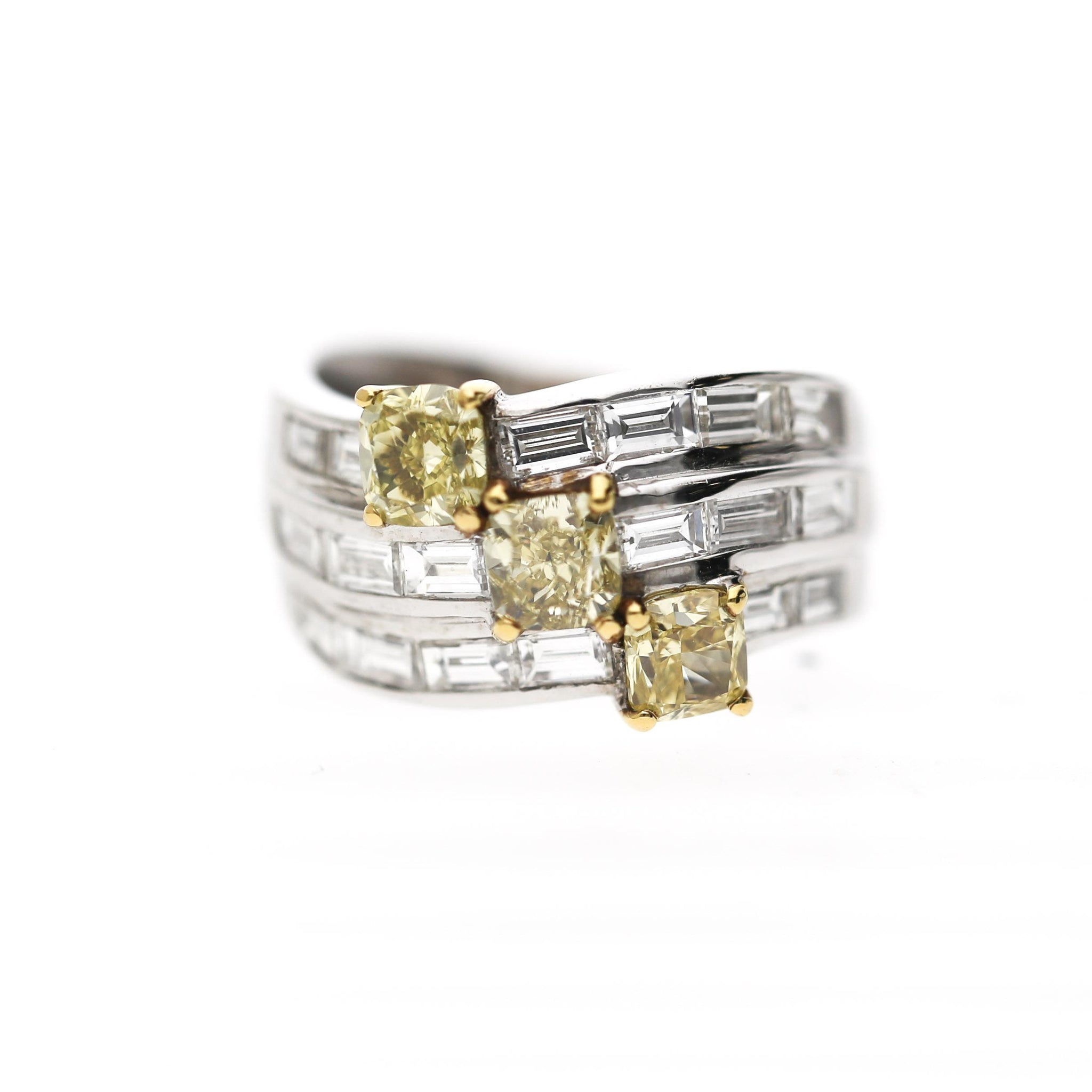 IGI-certified fancy colored cushion cut diamond 18K two-tone white and yellow gold wide bypass ring, featuring two fancy intense deep yellow and one fancy intense deep greenish yellow natural cushion diamonds staggered diagonally across a bold 11mm three-row baguette diamond channel-set bypass shank. Size 5, adjustable.