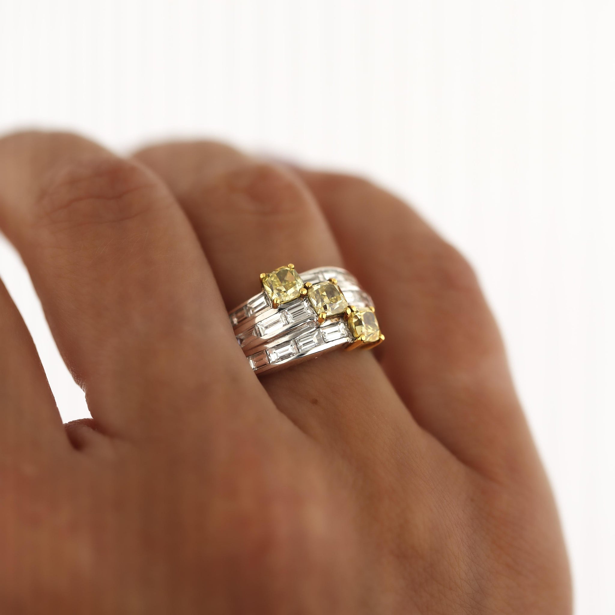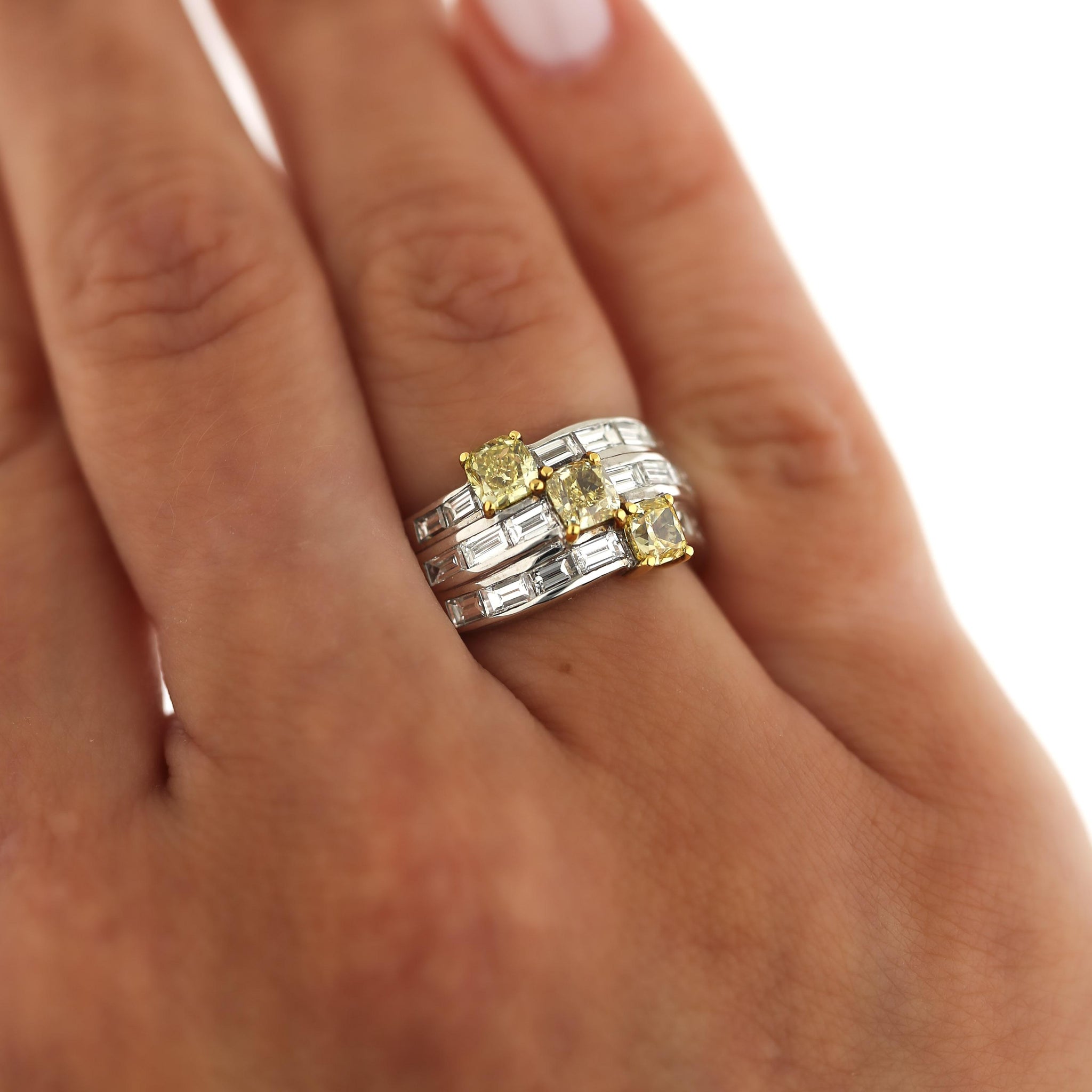 The setting is a dramatically wide 11mm bypass shank in 18K white gold, with three parallel rows of channel-set baguette diamonds sweeping diagonally across the finger in a wave formation — a bold architectural design that gives the ring a strong, sculptural presence well beyond its carat weight. Three yellow gold prong baskets rise from the baguette channel at staggered positions along the bypass, each holding one of the three fancy colored cushion diamonds in a diagonal cascade that creates visual movement and depth. The contrast between the crisp, linear white baguettes and the warm, vivid cushion fancy colored diamonds is the defining design tension of this ring, and it resolves beautifully in the two-tone gold construction.