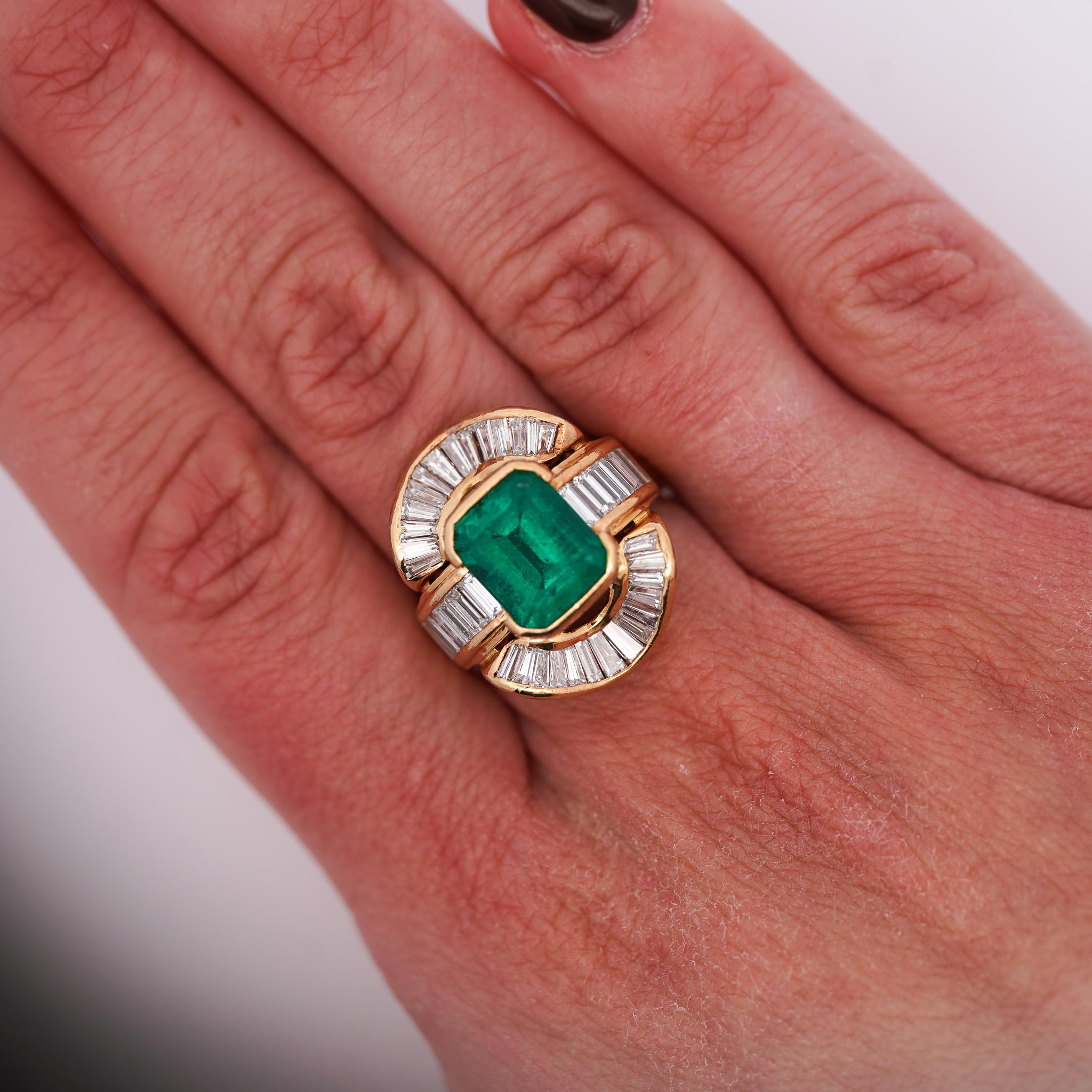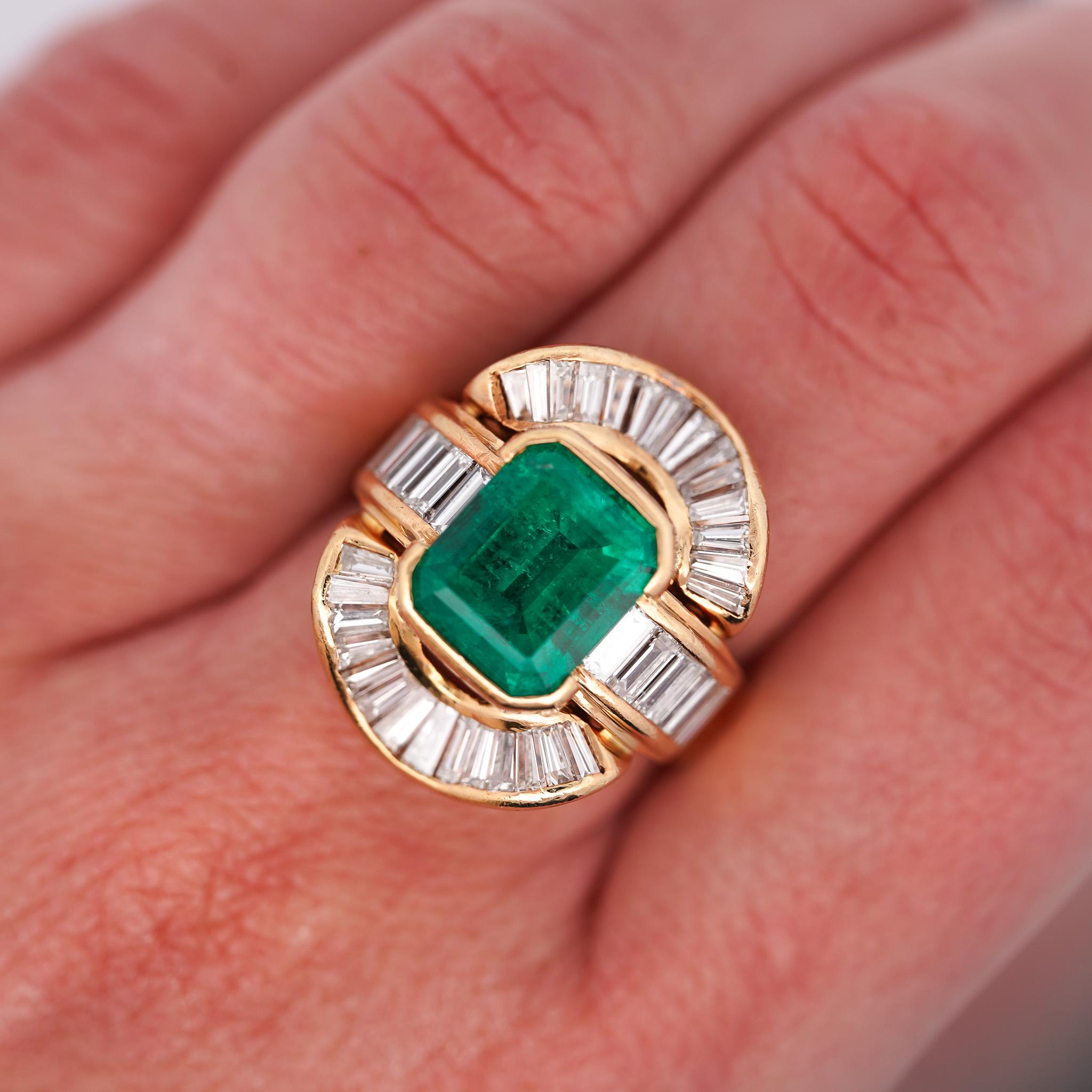 Natural vintage 18K yellow gold ballerina cocktail ring featuring a 3.85 carat vivid green emerald cut center stone in a full bezel surrounded by a sweeping radiating halo of channel-set baguette diamonds totaling 4.50 carats at F-G color, VS2 clarity, with additional baguette rows on the wide shoulders.