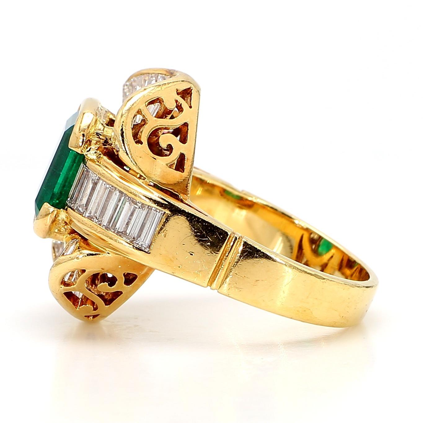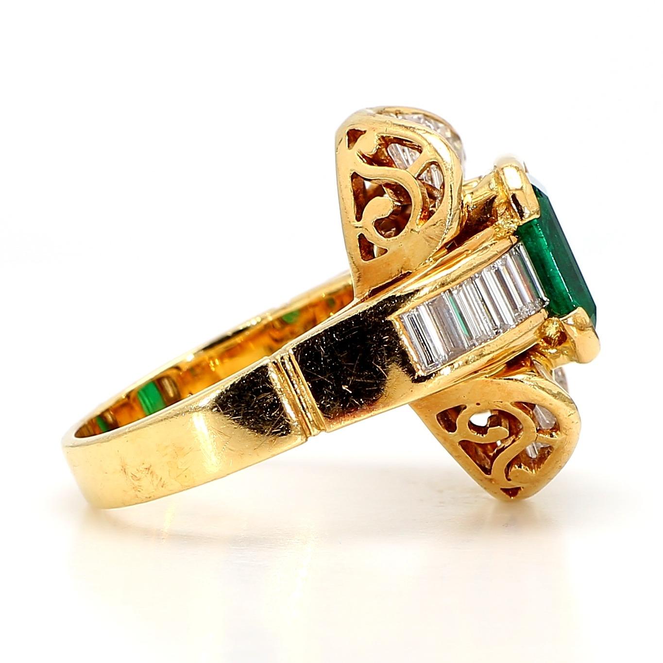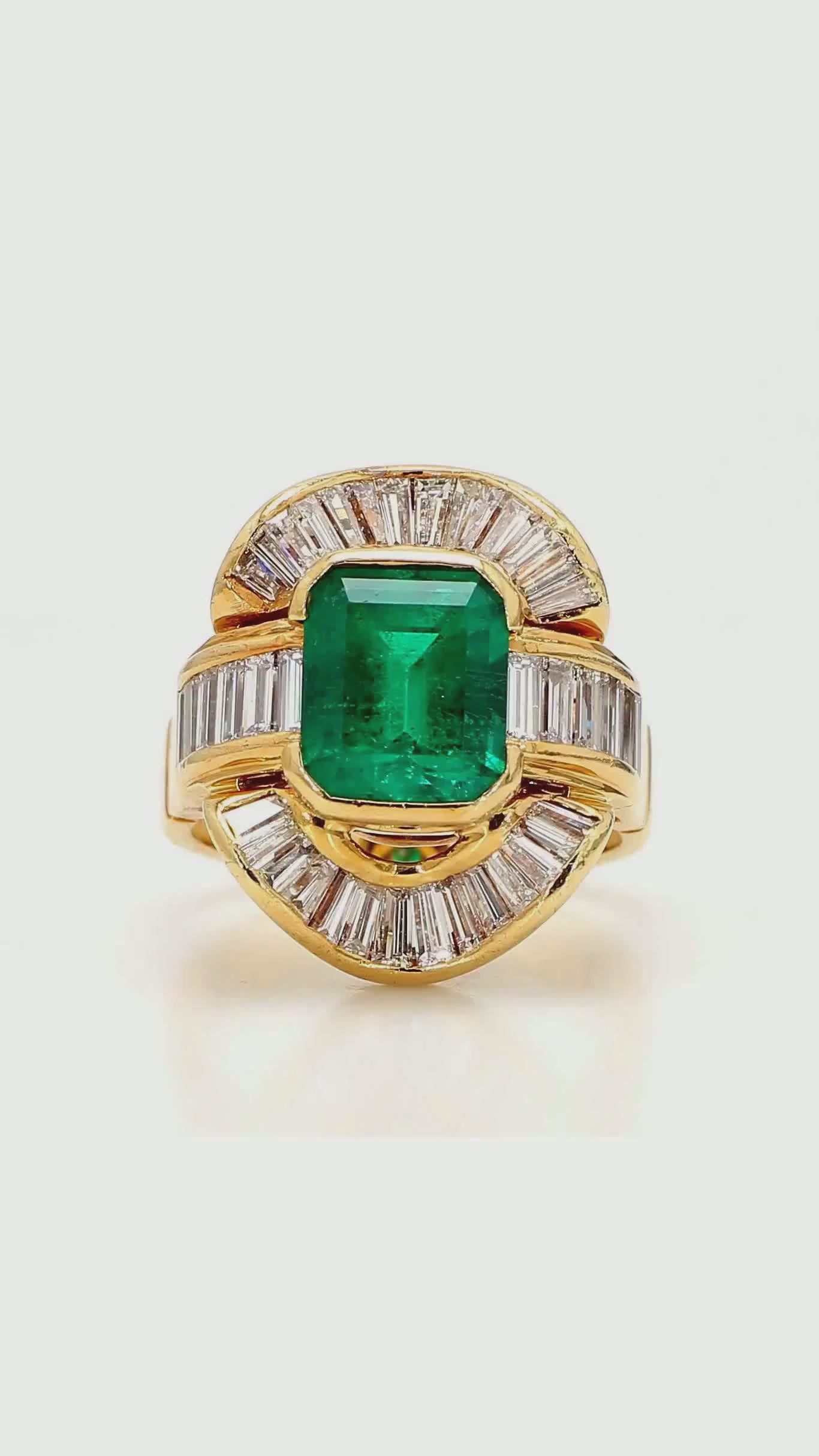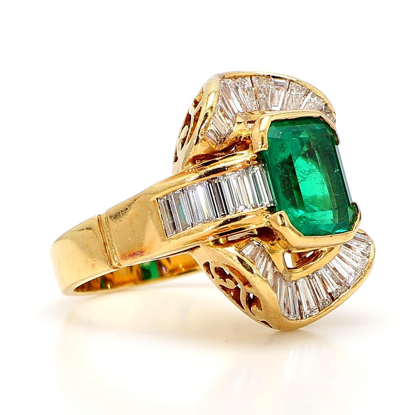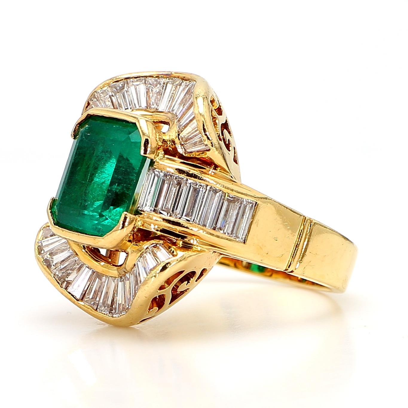 The 3.85 carat vivid green emerald cut center stone commands immediate attention with its rich, saturated color and the broad step-cut facets that produce sweeping, glassy reflections of vivid green — the emerald cut was historically developed specifically to best showcase the unique color depth of emeralds, and this stone demonstrates exactly why. The 4.50 carats of baguette diamonds at F-G color and VS2 clarity represent an extraordinary quantity of high-quality accent stones — near colorless and eye-clean — whose combined step-cut brilliance in the radiating ballerina arrangement amplifies the visual scale of the ring far beyond what either stone type could achieve alone. The total combined gemstone weight of over 8 carats between emerald and diamond, set in over 13 grams of solid 18K yellow gold, makes this ring a genuinely rare and significant collector piece that would stand out in any fine jewelry collection. Matching this ring to its companion ballerina earring pair creates one of the most complete and impactful vintage emerald and diamond parures available in the secondary fine jewelry market.