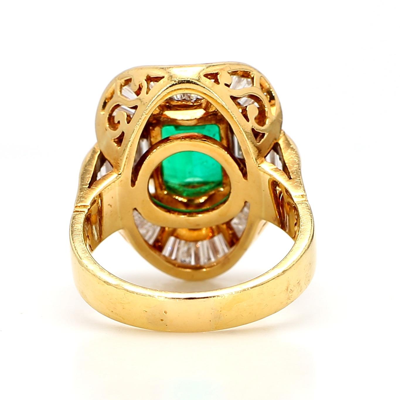 The setting is one of the most architecturally ambitious ballerina ring designs — the emerald cut center stone sits in a full yellow gold bezel at the heart of a large oval face, with baguette diamonds radiating outward in graduated fan channels above and below in the classic ballerina pattern, while additional baguette diamond channels run horizontally across the wide shoulders on each side. The open scroll gold gallery beneath the stone, visible from the reverse, reveals the quality and weight of the mounting construction, with decorative yellow gold scrollwork cutouts that give the ring a museum-quality artisan character from every angle. At 13.77 grams of solid 18K yellow gold and a 21.7 x 16.5mm face — nearly the size of a postage stamp — this ring is among the most substantial and visually commanding vintage cocktail rings available at any price point.