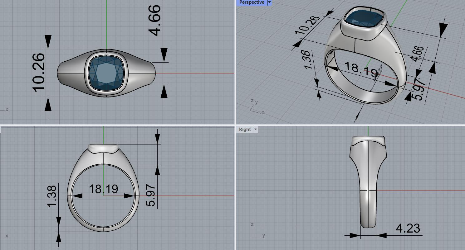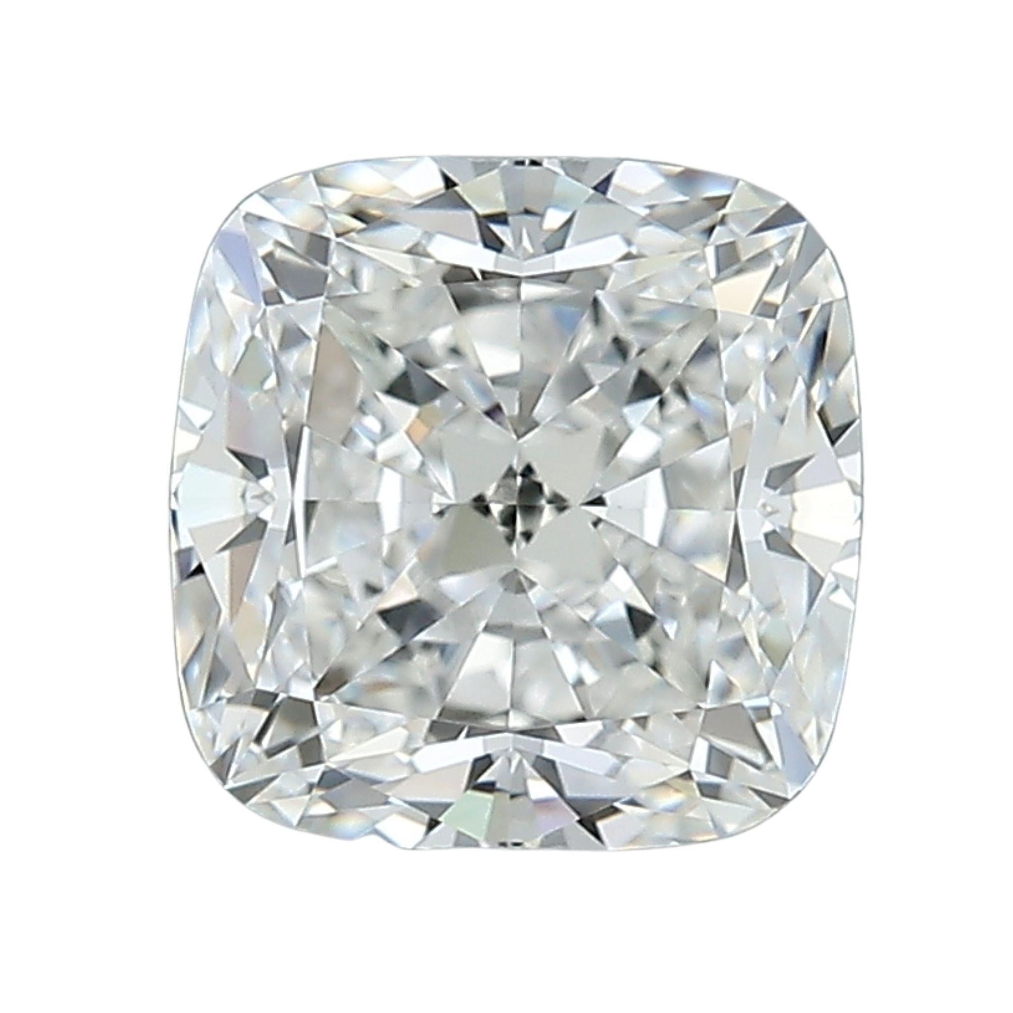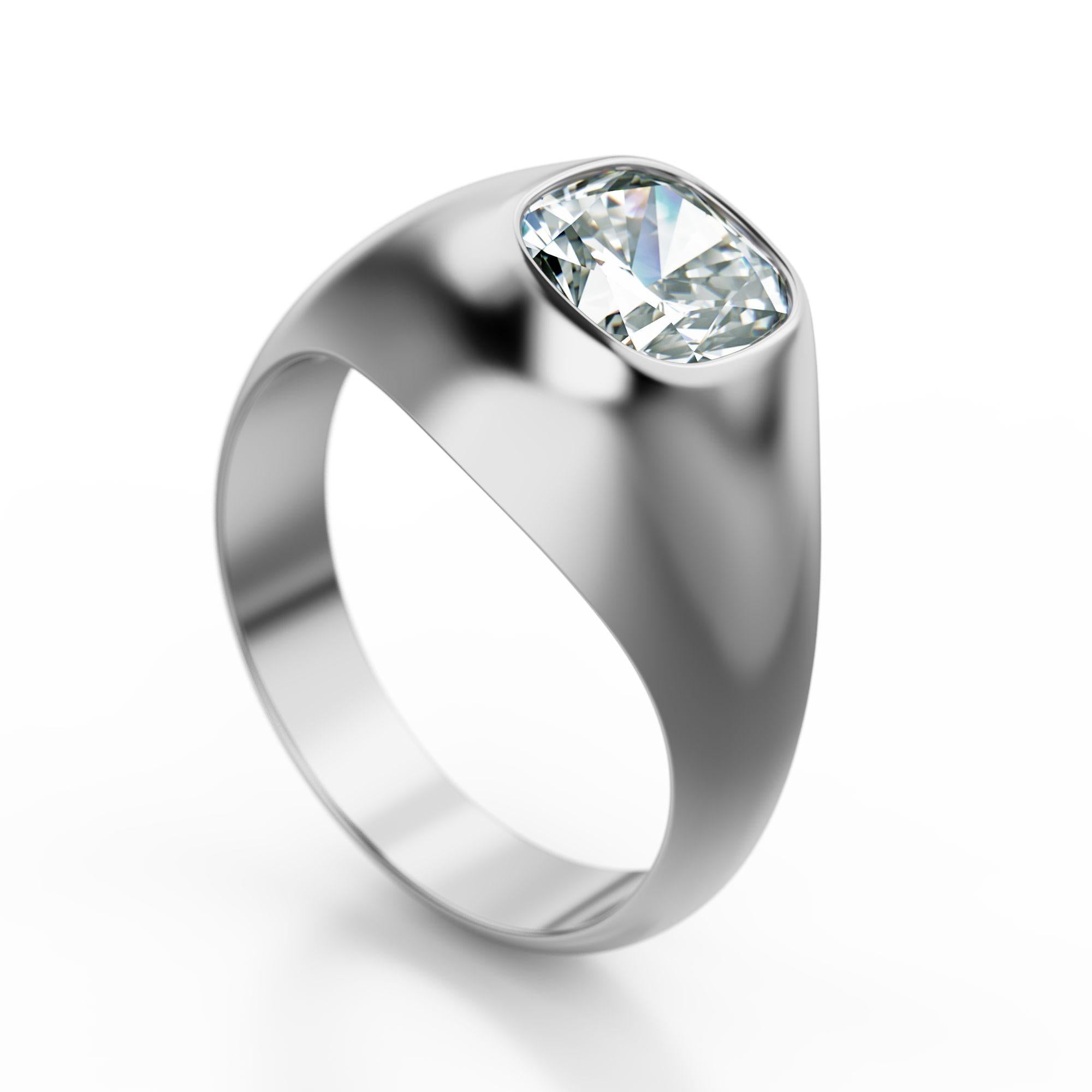 The stone is loose and can be made in several setting configurations. The pictured listing features an 18K white gold wide bezel men's setting showcasing the diamond's classic cushion shape with soft rounded corners. Production Time: 1-2 weeks. Item rendered in ring size 8, adjustable upon request.