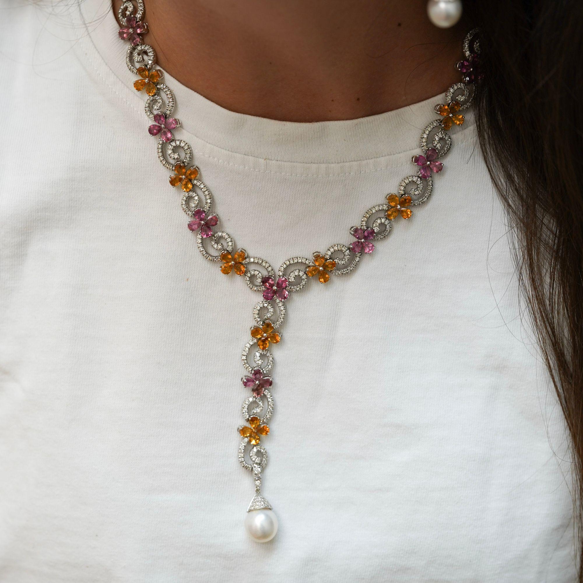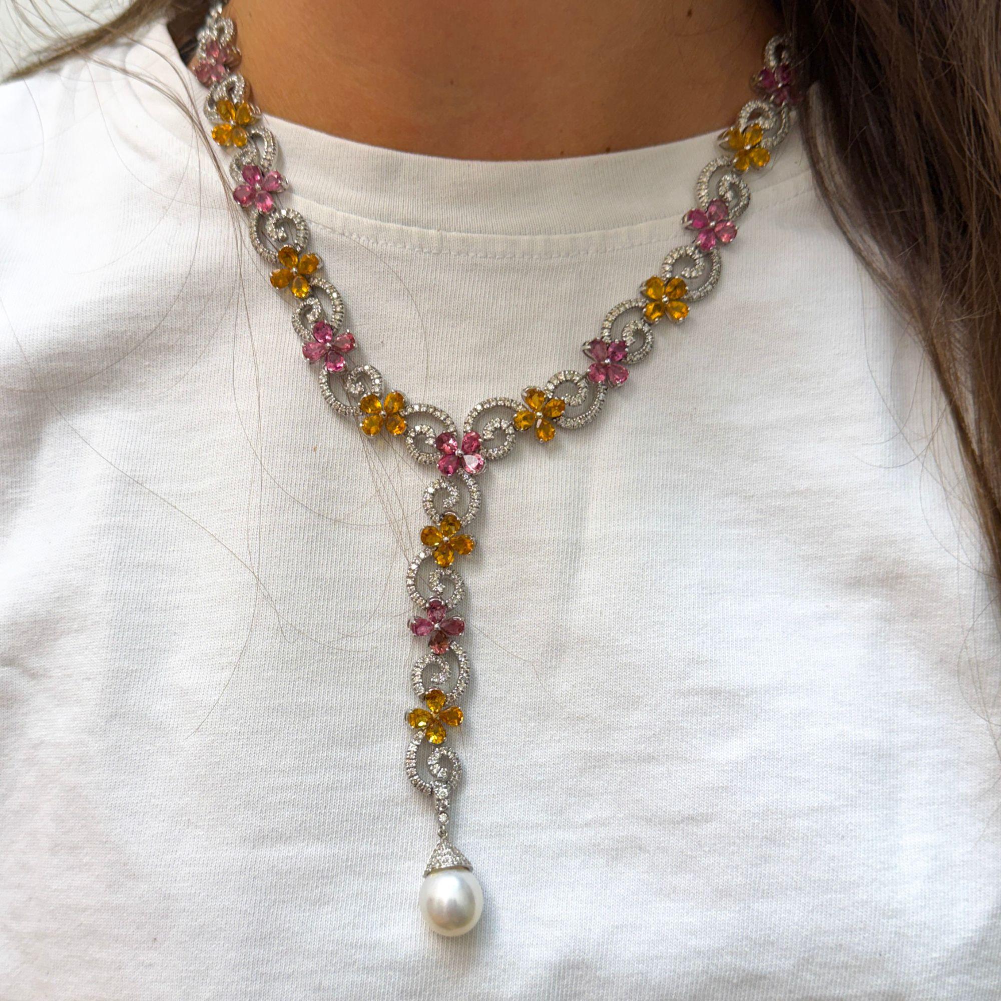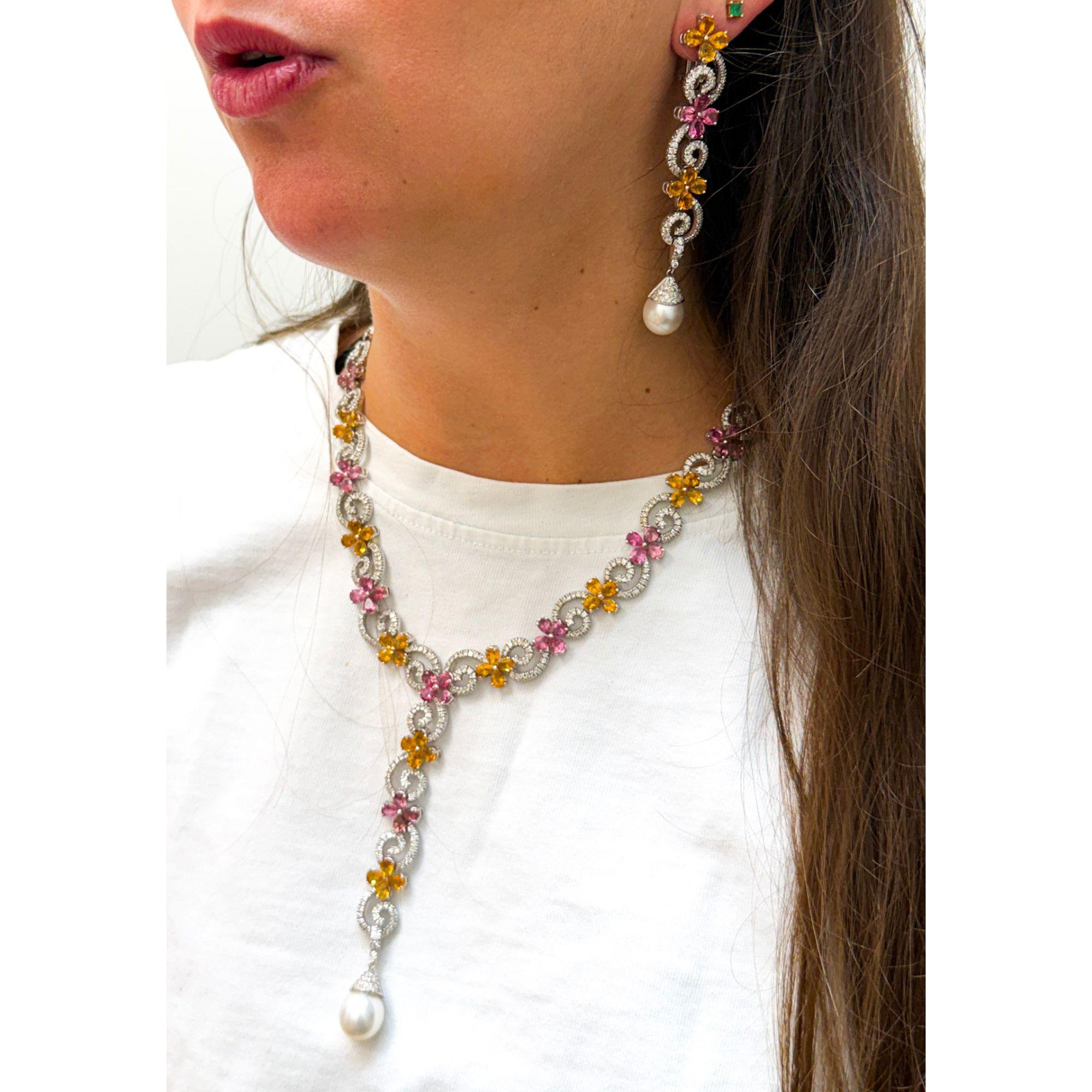 Intricate woven floral motifs create dimensional lattice patterns entirely pave-set with 12 carats of near-colorless E-F diamonds throughout both pieces, providing continuous sparkle and brilliance. The earrings feature graduated floral elements descending 3 inches, punctuated with alternating pink tourmalines and yellow garnets in prong settings, terminating in 11mm South Sea pearl drops that add elegant movement. The matching lariat necklace presents an 18-inch chain composed of interconnected floral links with 32 pink tourmalines and 32 yellow citrines strategically placed throughout, extending into a 3-inch adjustable lariat drop for versatile styling options. The 18K white gold construction provides neutral backdrop that enhances the pastel pink and warm yellow gemstone colors while the micro-pave diamond work creates texture and dimension across every surface.