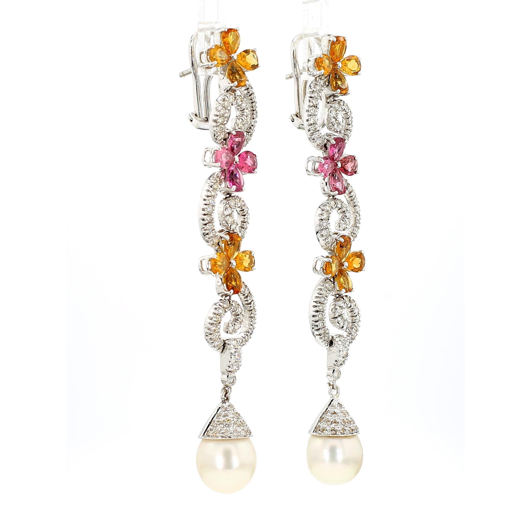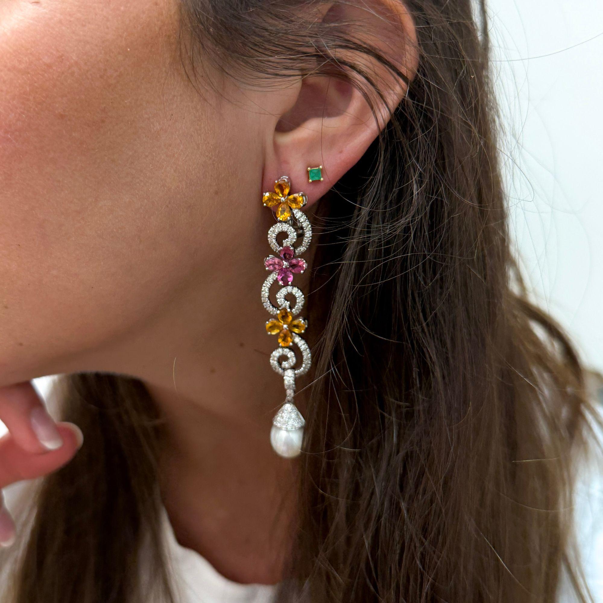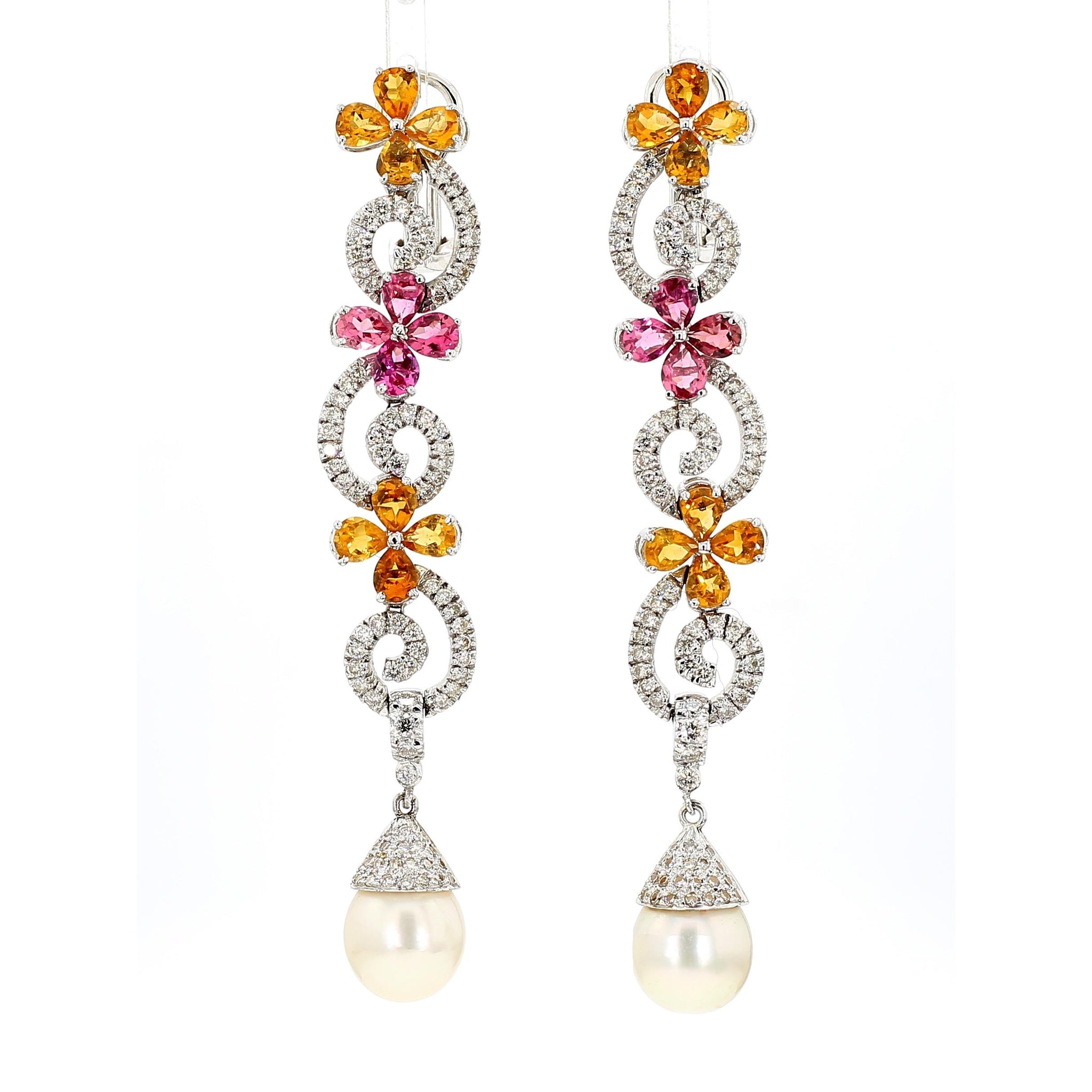 Intricate woven floral motifs create dimensional lattice patterns entirely pave-set with 12 carats of near-colorless E-F diamonds throughout both pieces, providing continuous sparkle and brilliance. The earrings feature graduated floral elements descending 3 inches, punctuated with alternating pink tourmalines and yellow garnets in prong settings, terminating in 11mm South Sea pearl drops that add elegant movement. The matching lariat necklace presents an 18-inch chain composed of interconnected floral links with 32 pink tourmalines and 32 yellow citrines strategically placed throughout, extending into a 3-inch adjustable lariat drop for versatile styling options. The 18K white gold construction provides neutral backdrop that enhances the pastel pink and warm yellow gemstone colors while the micro-pave diamond work creates texture and dimension across every surface.