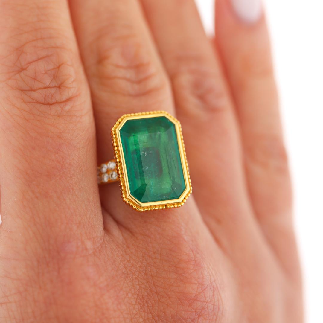 8.57 Carat Vivid Green Emerald and Diamond Milgrain Bezel 18K Gold Ring