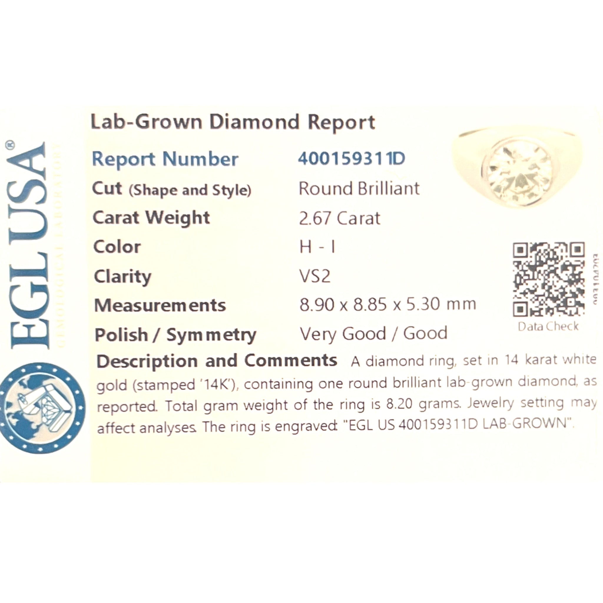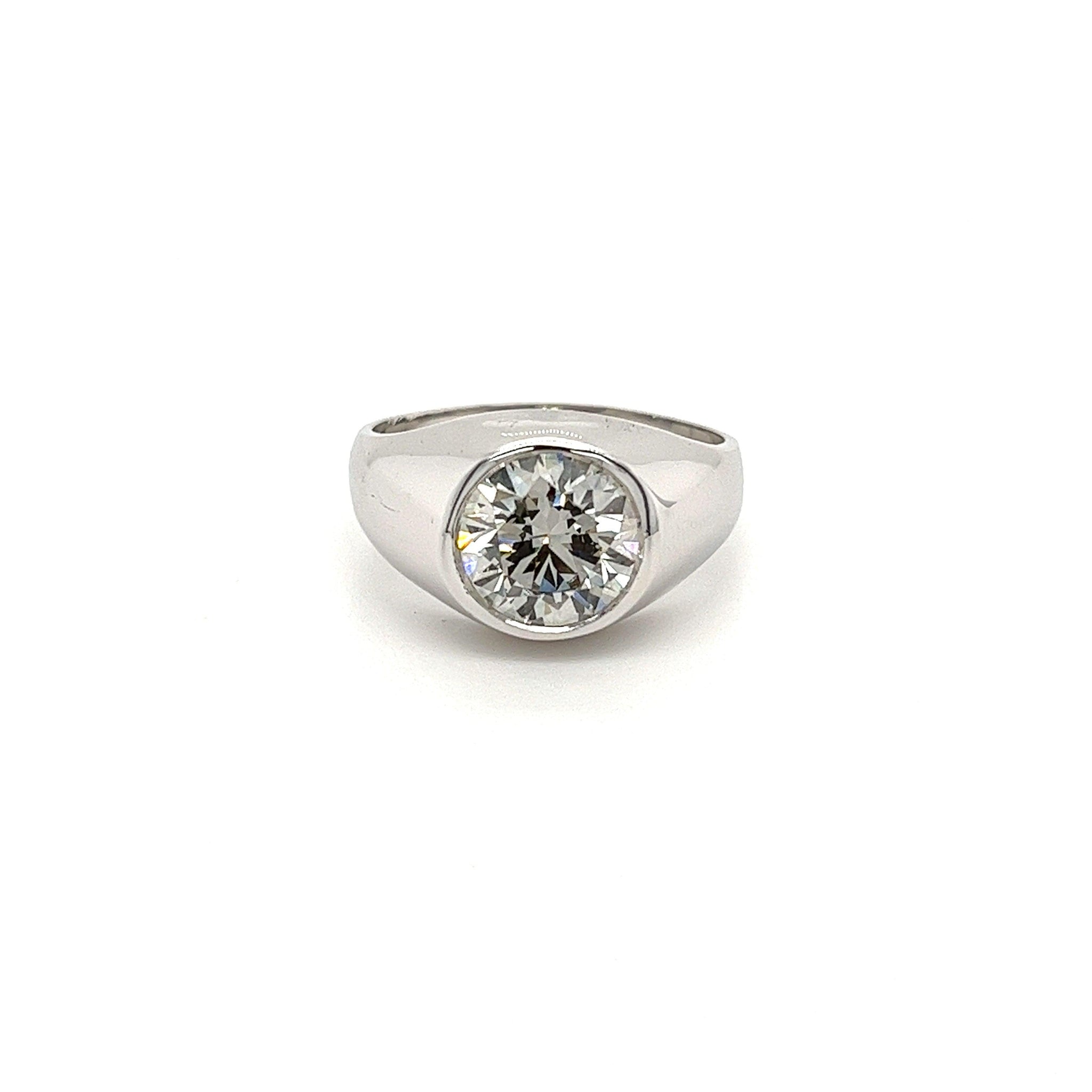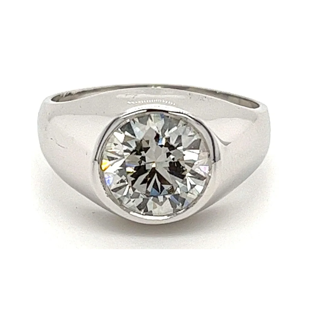 Monture de Bague pour homme en or blanc 14K sertie d'un diamant rond de 2,67 carats, cultivé en laboratoire et certifié EGL.