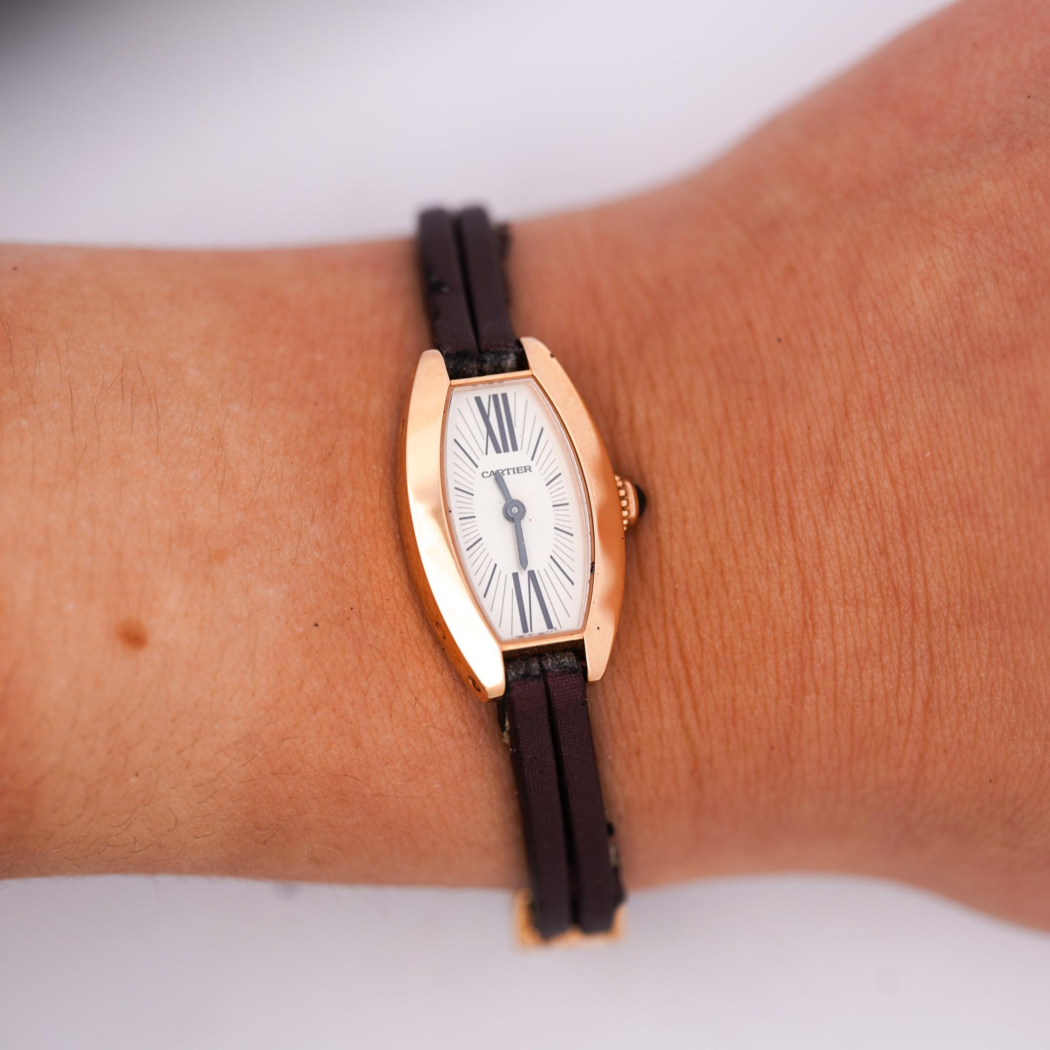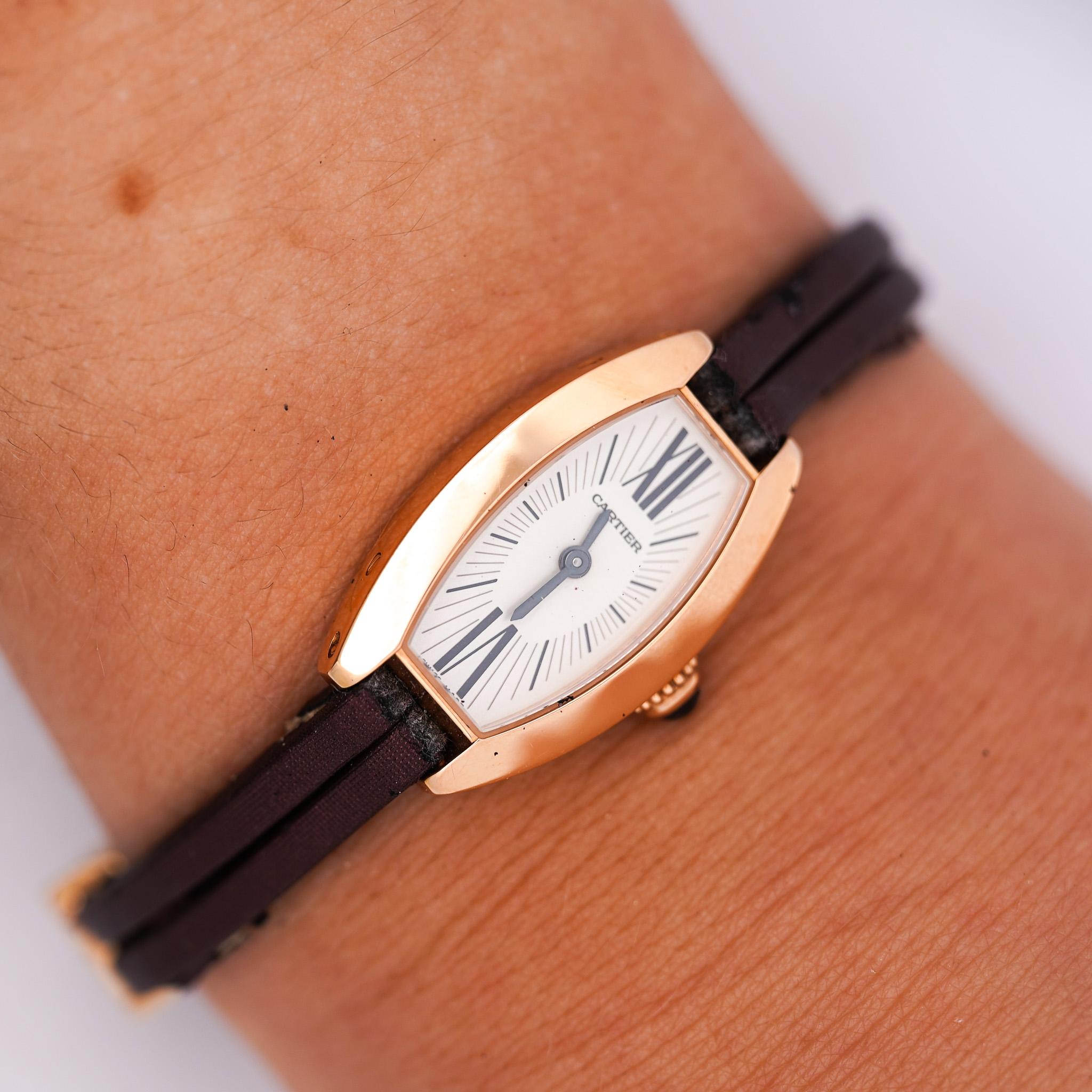Cartier Mini Tonneau Lanieres in 18K rose gold featuring elongated barrel case with signature Roman numeral dial and sapphire cabochon crown. Quartz movement with original burgundy double-wrap leather strap, includes extra set of straps. Weighs 21 grams total.