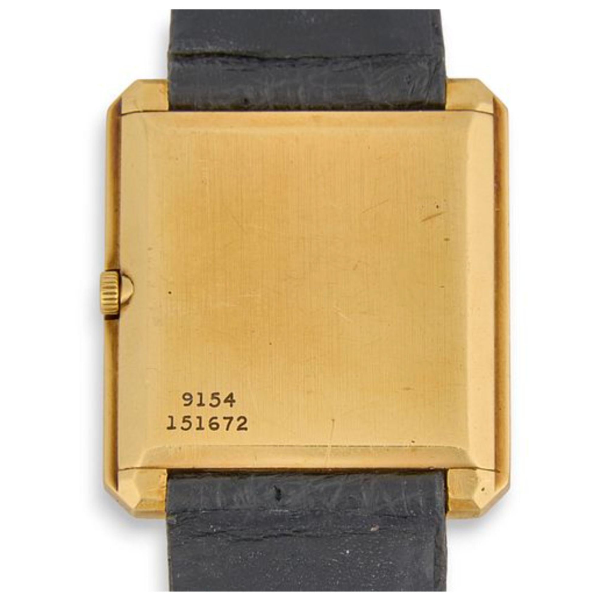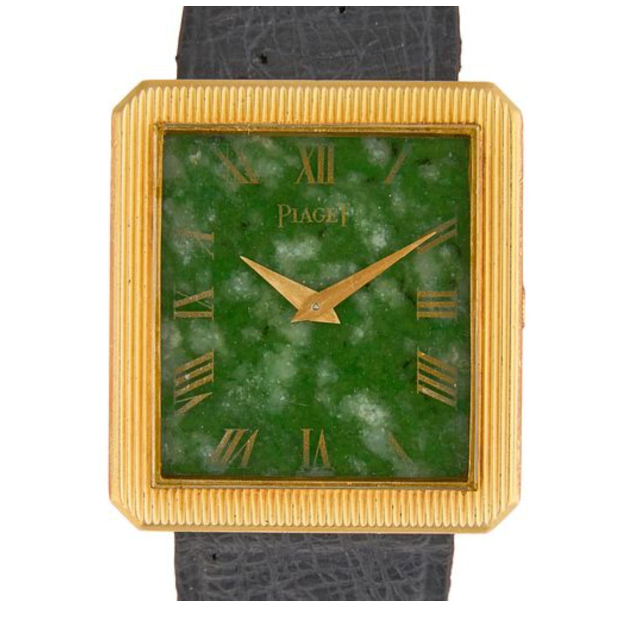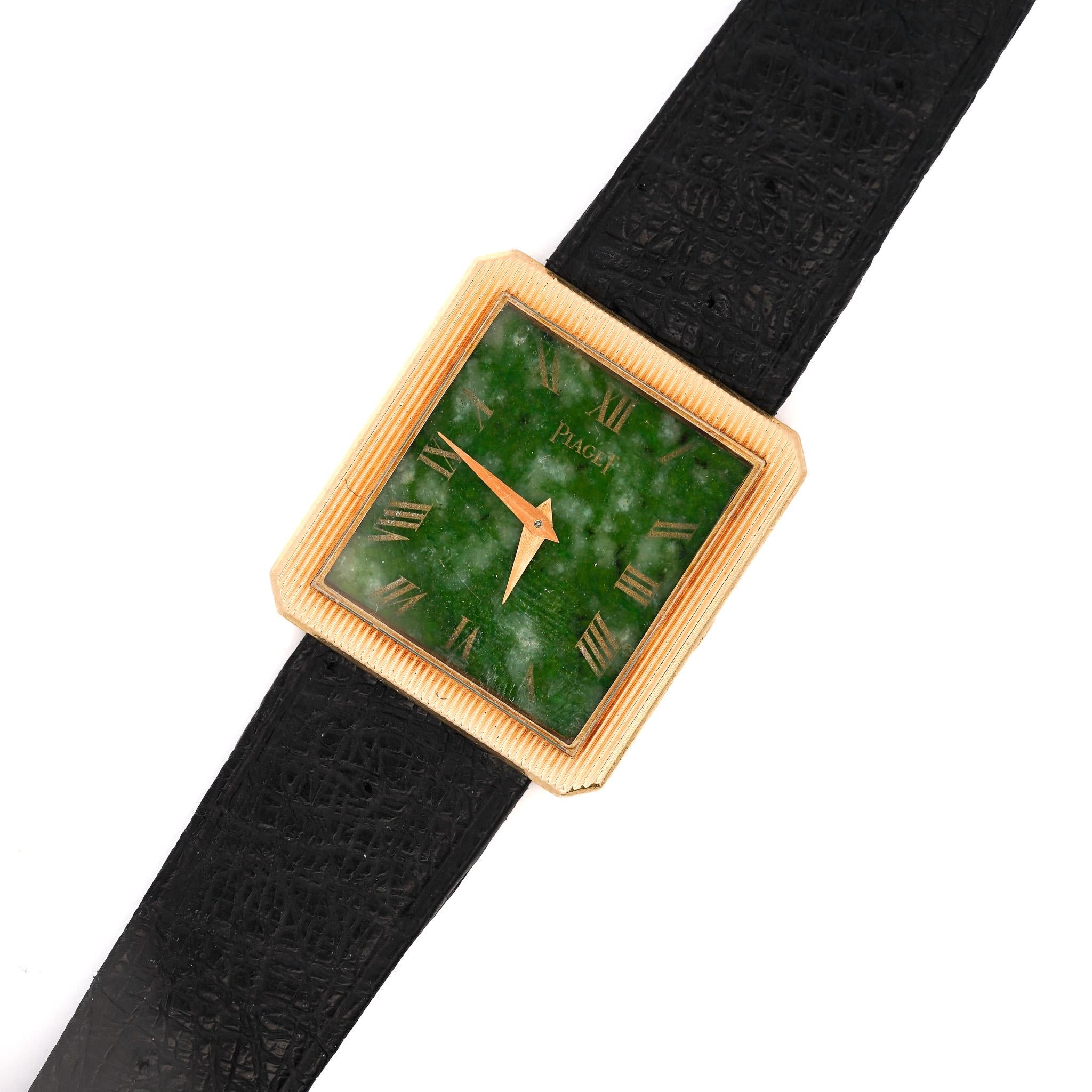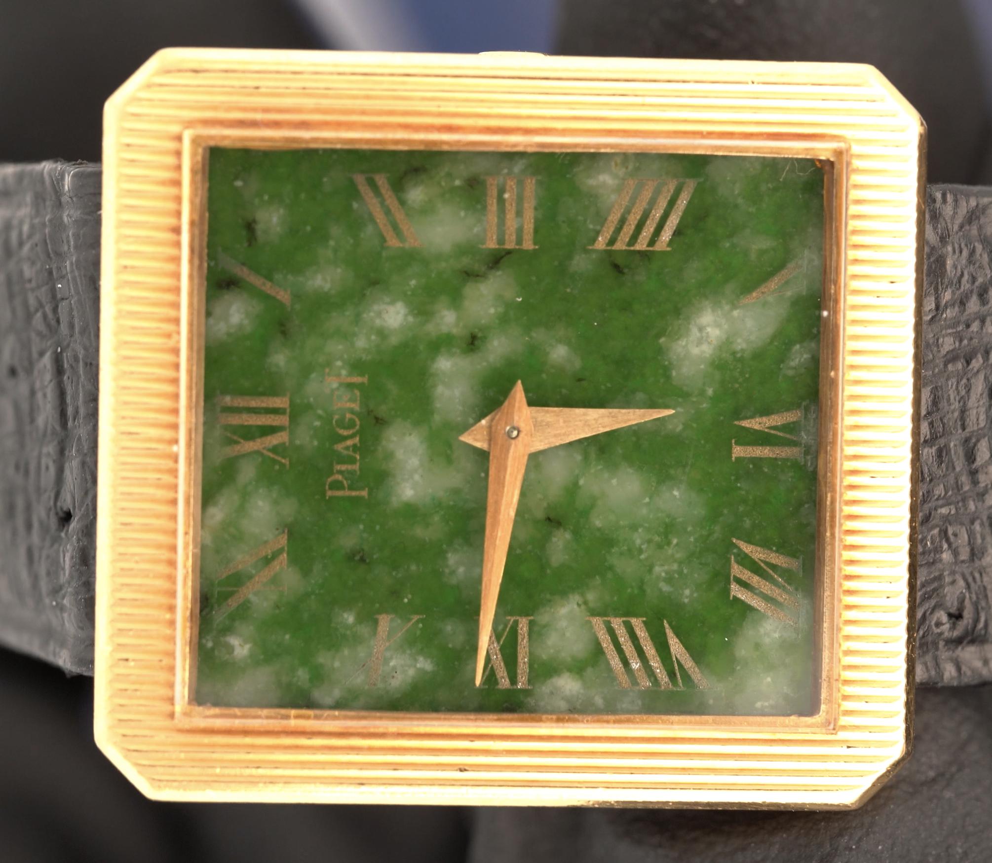 Rare Vintage Piaget Protocole manual-wind watch in 18K yellow gold featuring square case with natural jade dial and Roman numeral markers. Black leather Piaget strap with gold-tone buckle, total weight 26.16 grams, dial measures 25.4mm. A truly unique find. The dial is made with a natural Jadeite Jade slap with Roman Numeral hour markers carved using diamond tipped tools, which is later gold plated.