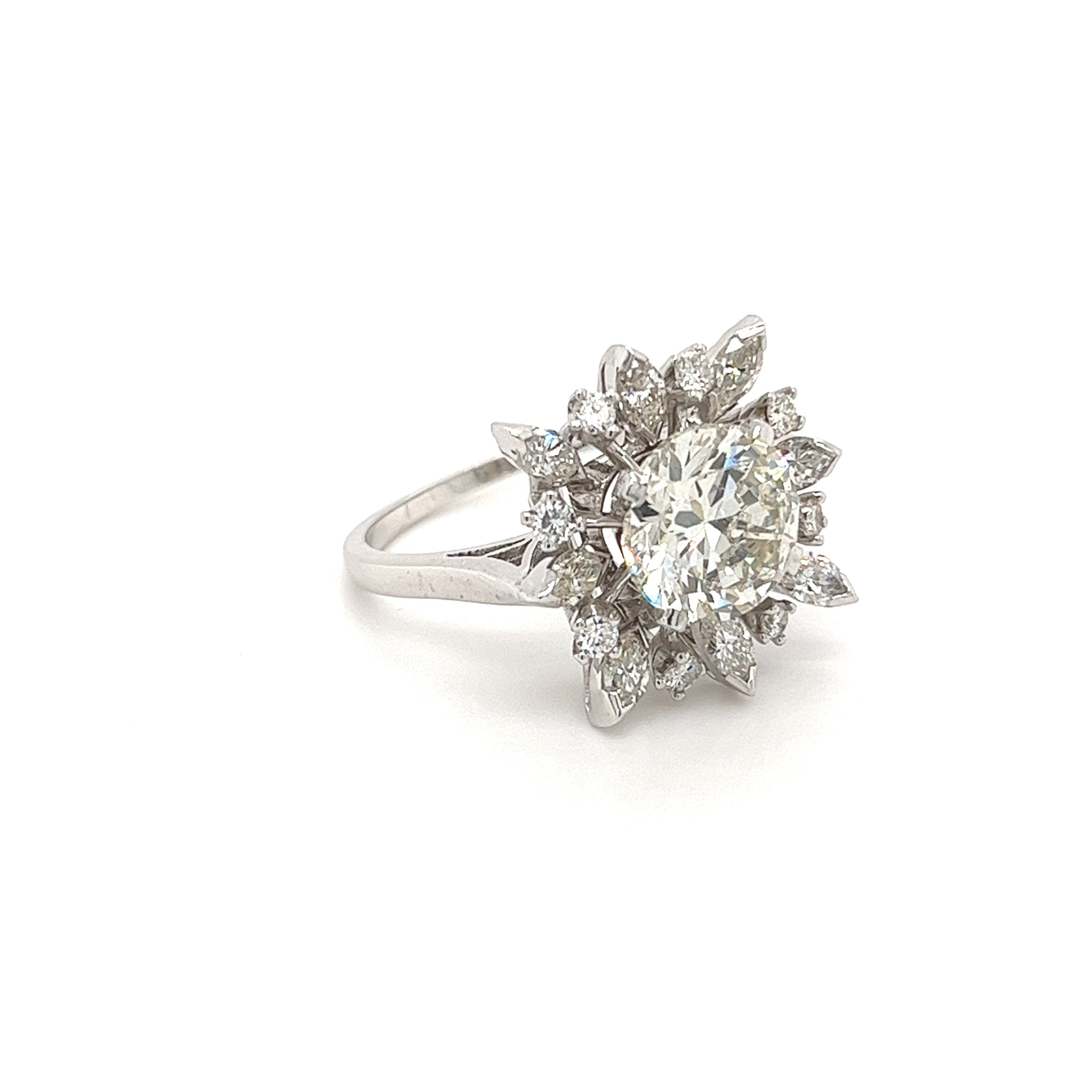 The diamond halo features natural marquise and round cut diamonds side by side in mesmerizing symmetry and grace. This ring is anything but the typical cookie cutter diamond engagement ring.