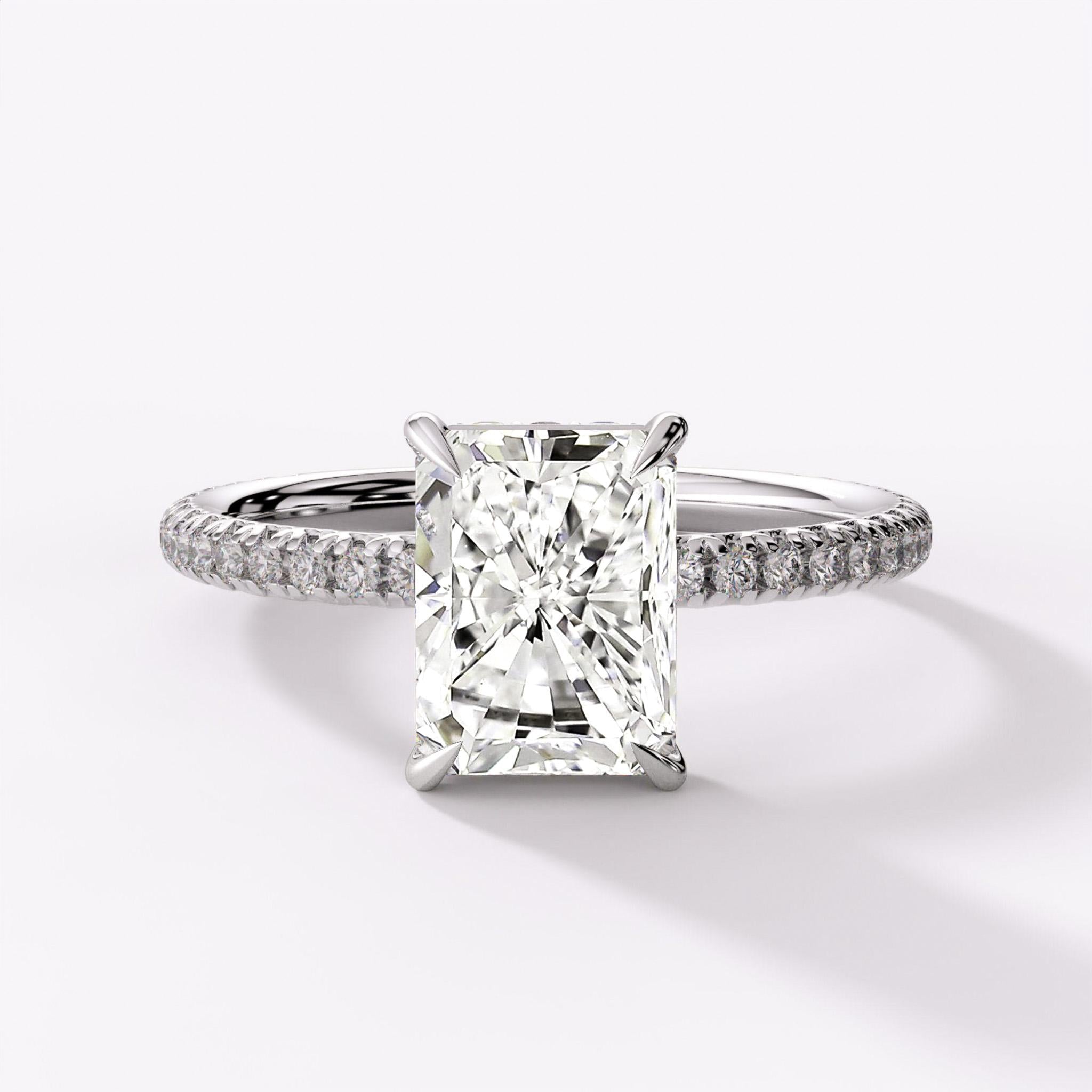 This elegant engagement ring showcases the elongated radiant cut diamond in a 4-prong basket setting with a hidden halo of pavé diamonds wrapping underneath the center stone. The delicate full pavé diamond band adds continuous sparkle while the 18K white gold construction provides maximum durability. The hidden halo enhances the center stone's brilliance from all angles while the refined band ensures comfortable everyday wear.