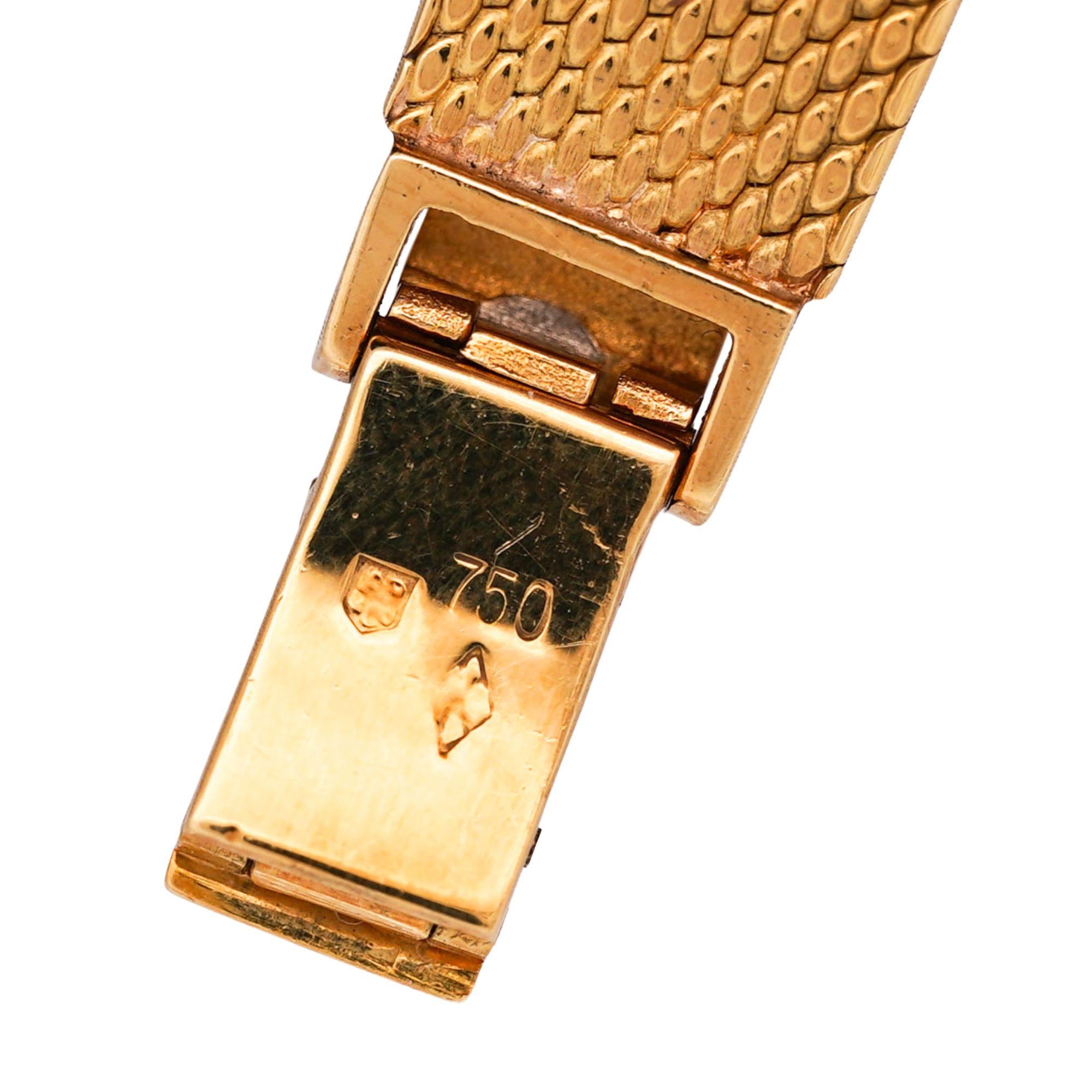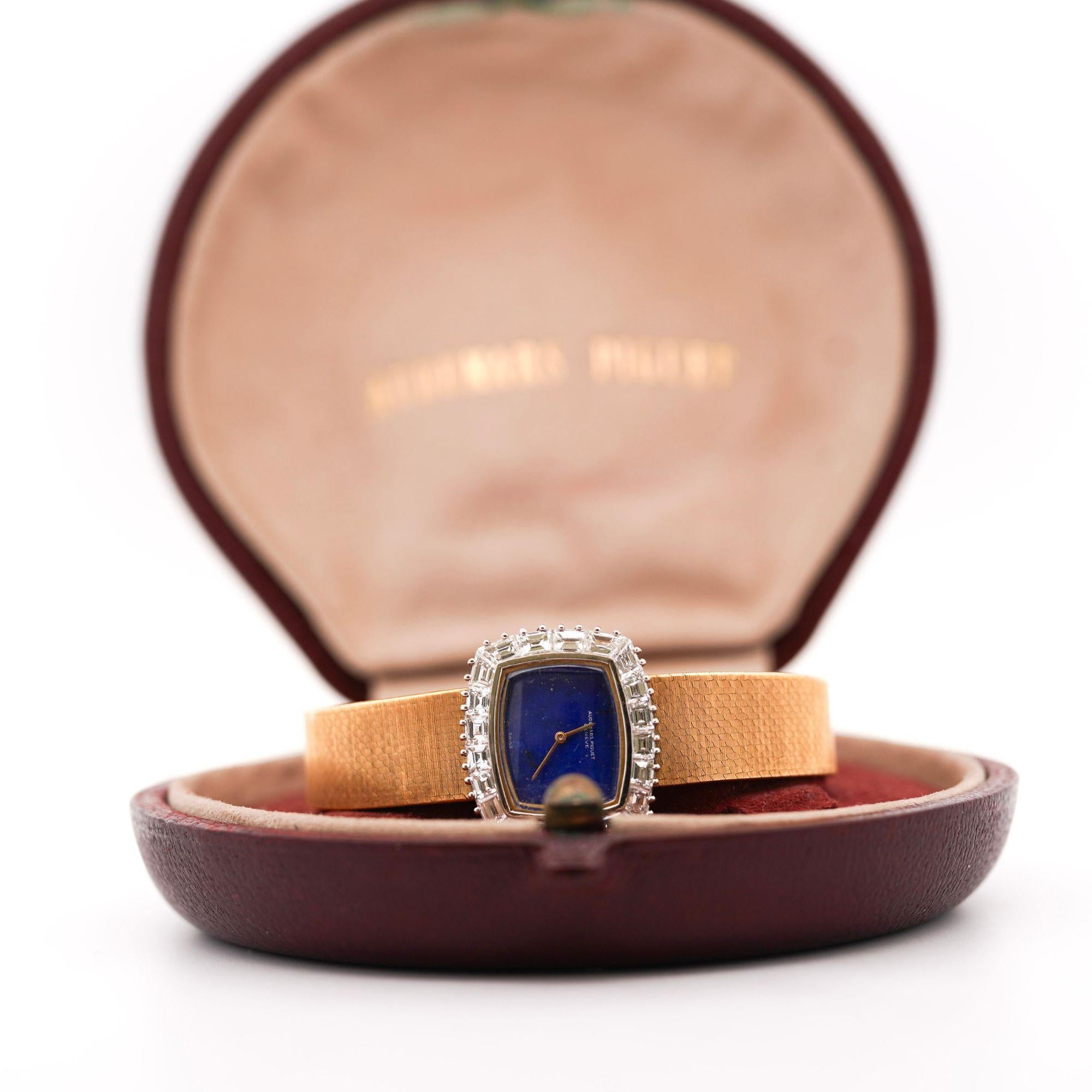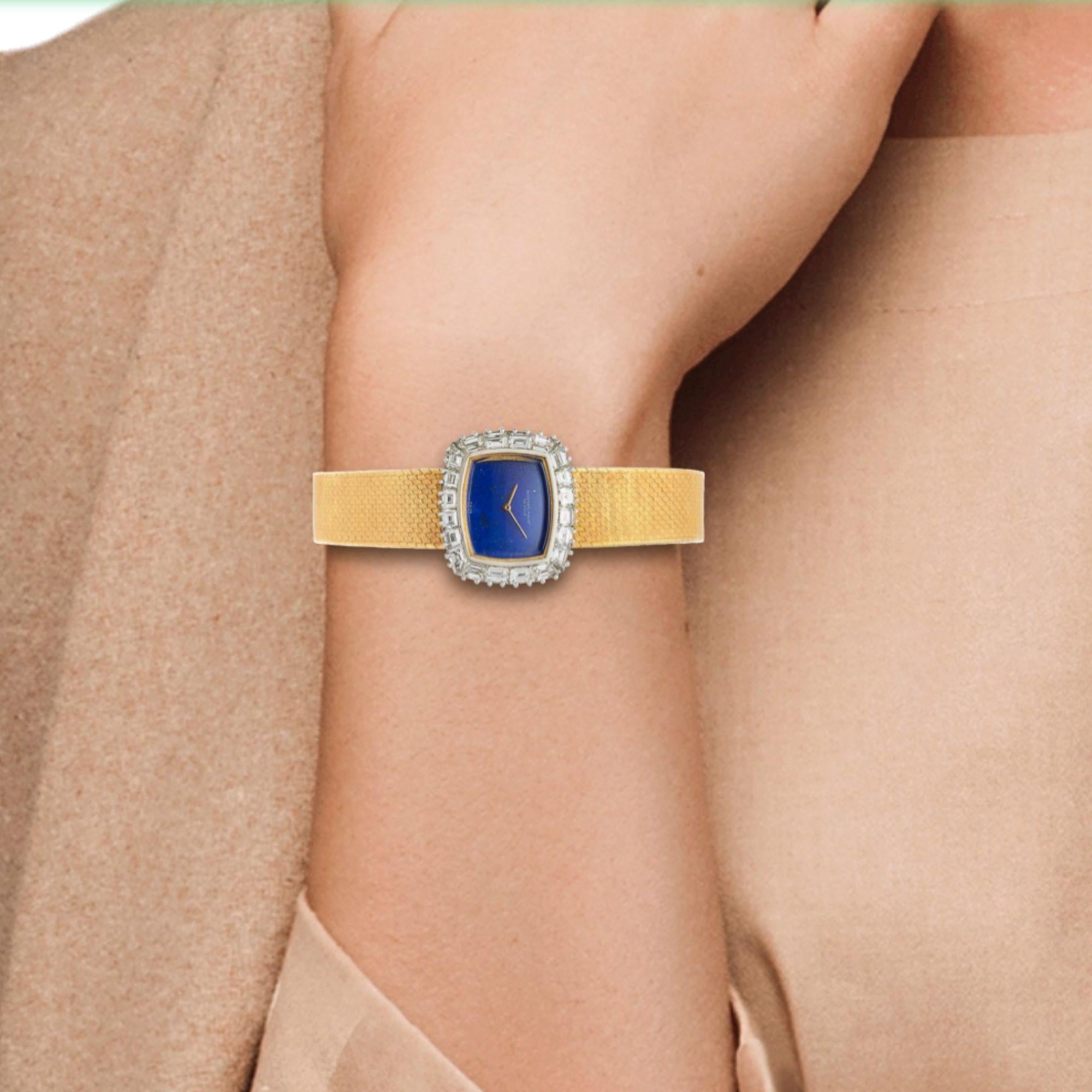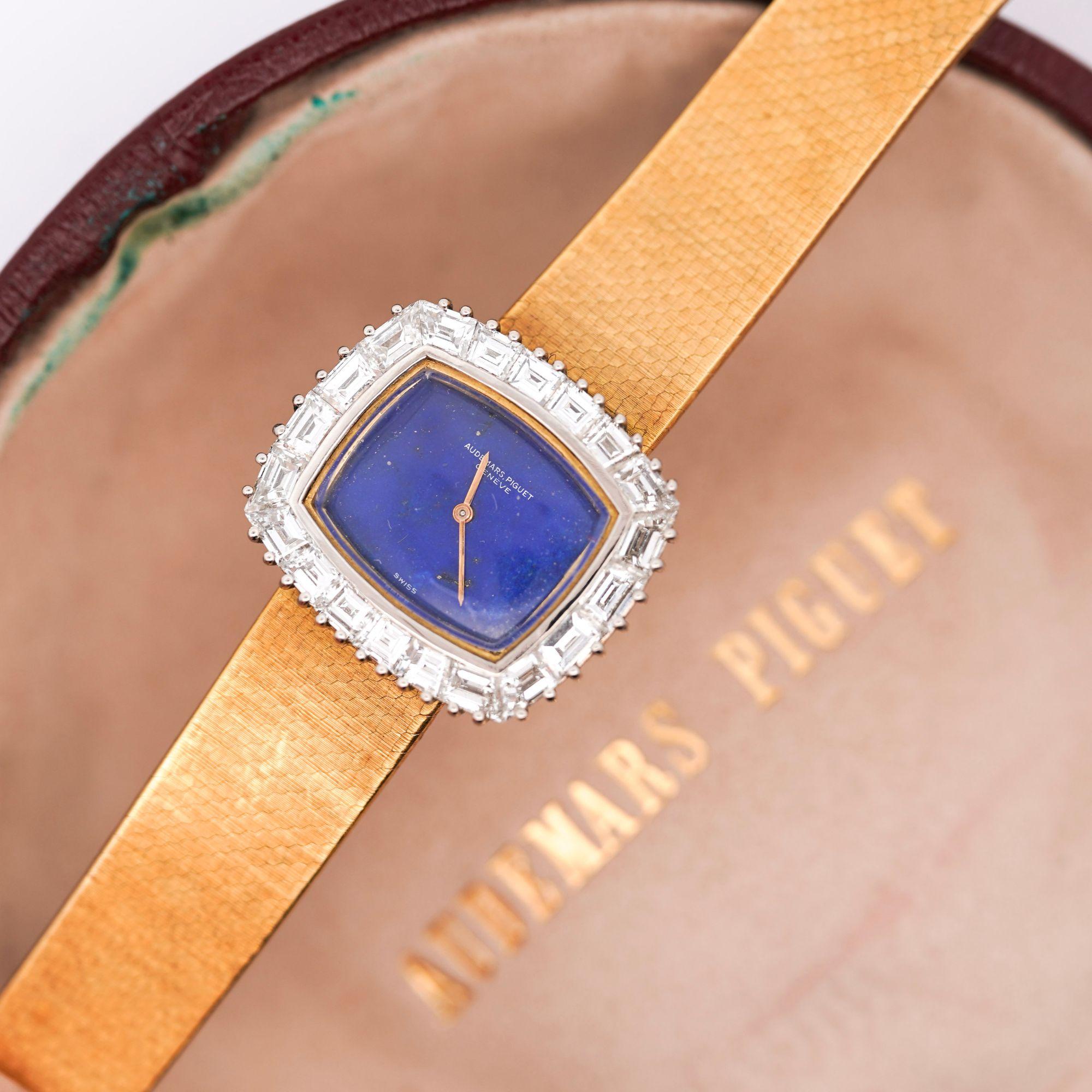 Audemars Piguet established its reputation as one of Switzerland's premier independent watchmakers in 1875, maintaining family ownership and haute horlogerie traditions for nearly 150 years. During the 1960s, the manufacture created distinctive ladies watches combining precious materials like hardstone dials and custom-cut diamond bezels with refined mechanical movements, targeting sophisticated clientele seeking jewelry watches with genuine horological substance. This lapis lazuli dial example represents Audemars Piguet's commitment to decorative arts, selecting natural gemstone material for its intense color and unique pyrite inclusions that create natural sparkle mimicking starlight. The calibré-cut diamond bezel demonstrates advanced gem-cutting expertise, with each diamond individually shaped to follow the cushion case's curved perimeter—a labor-intensive technique reserved for highest-quality jewelry watches. At 46.20 grams in solid 18K gold with approximately 25-50 D-E-F color VS clarity diamonds, this watch delivers substantial intrinsic value alongside Audemars Piguet's prestigious name. The manual wind movement remains in running order though servicing is recommended for optimal performance and longevity.
