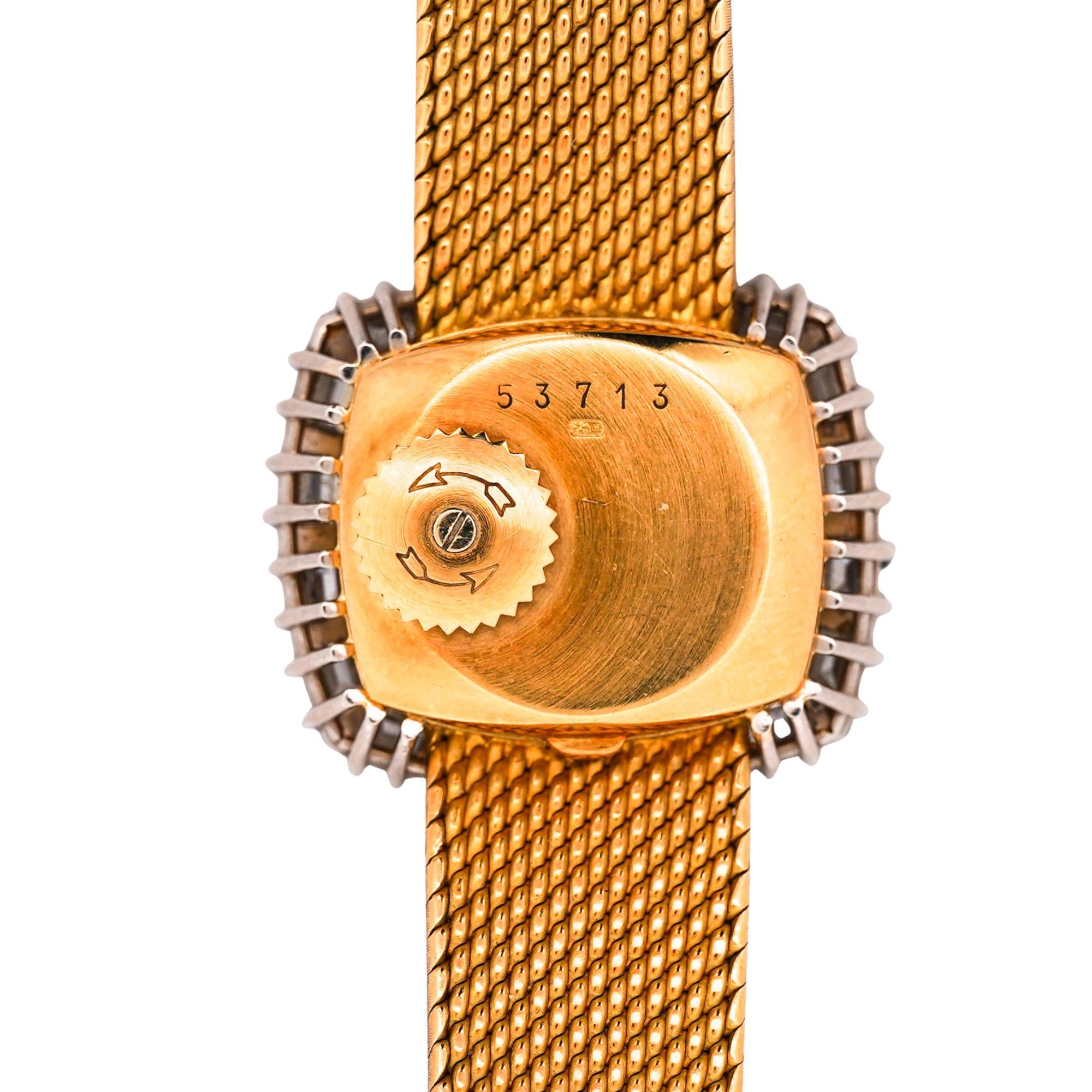 Audemars Piguet ladies watch featuring natural lapis lazuli dial in 18K yellow gold cushion case with AP factory calibre-cut diamond bezel. Manual wind movement in running order, integrated woven mesh bracelet, measuring 23 x 20mm, weighing 46.20 grams, includes original signed presentation box. 6.25 inch length.