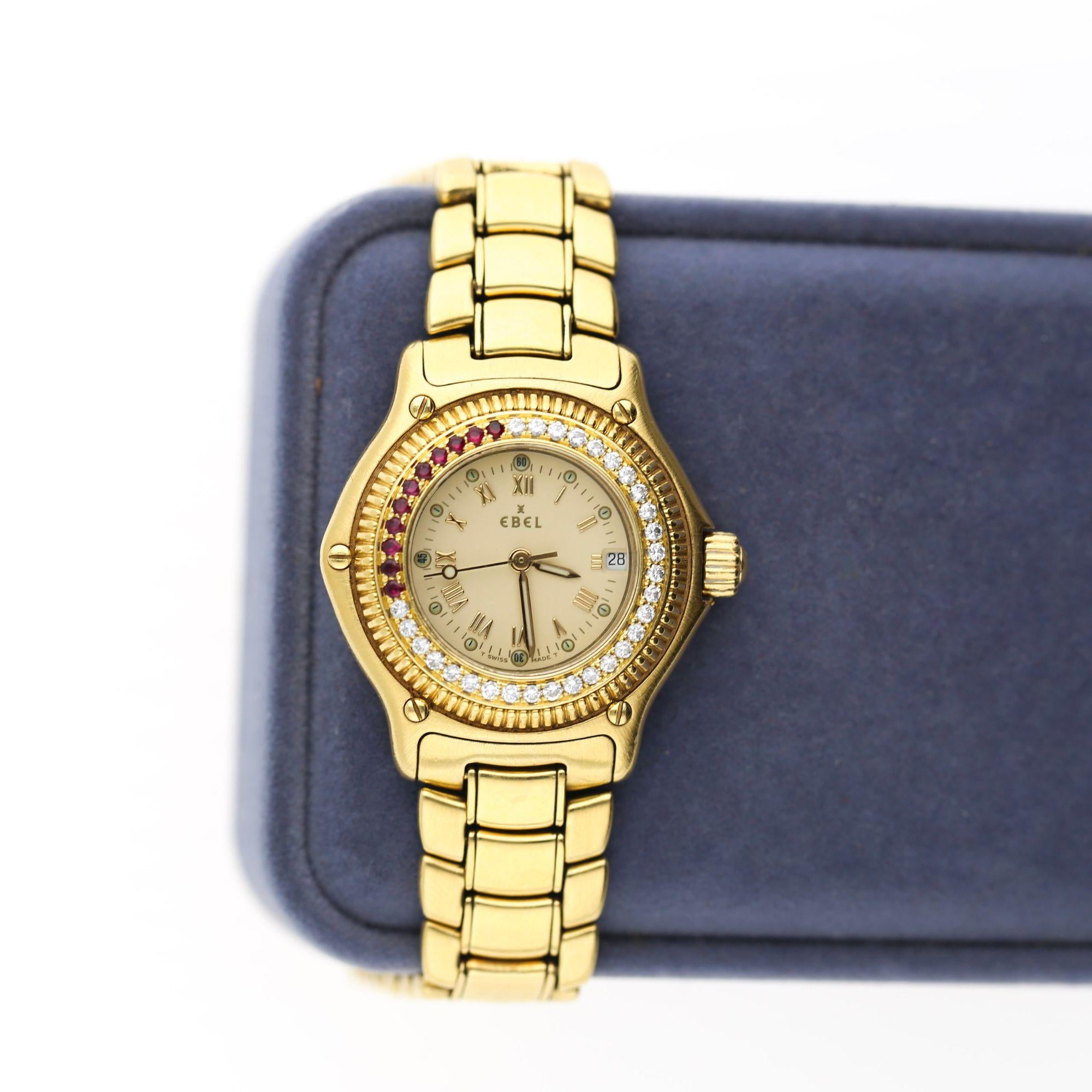 Ebel's Discovery collection represents the brand's signature seamless case-to-bracelet integration philosophy. At 106.28 grams in solid 18K yellow gold with ruby and diamond bezel, this watch functions as both timepiece and fine jewelry. The Swiss quartz movement ensures accurate timekeeping.